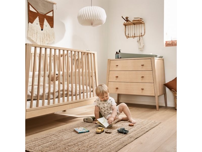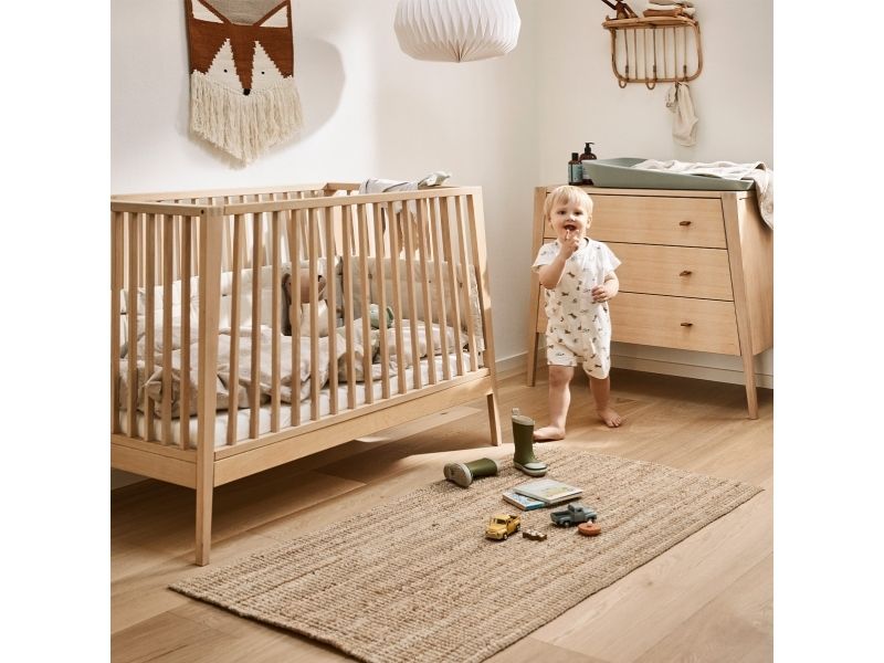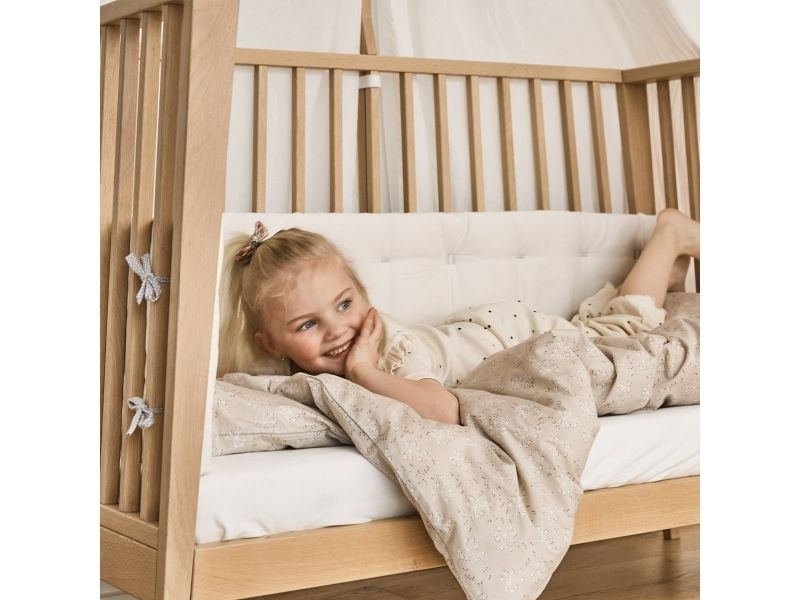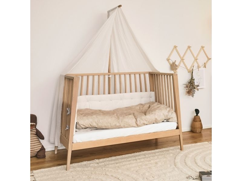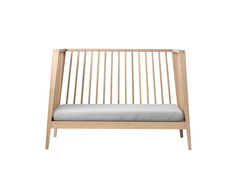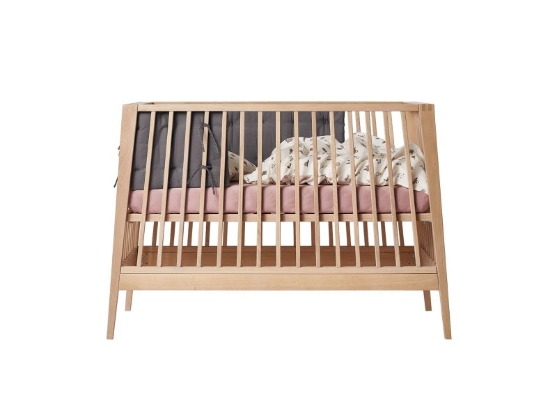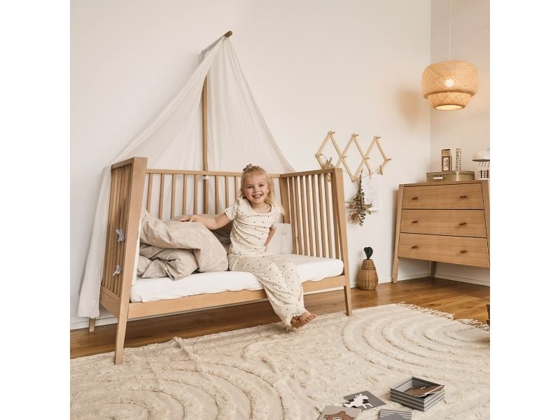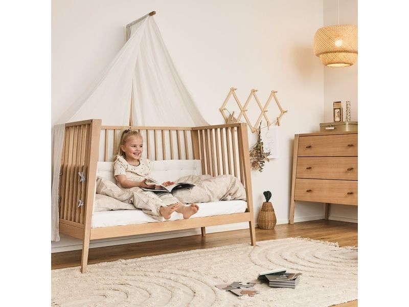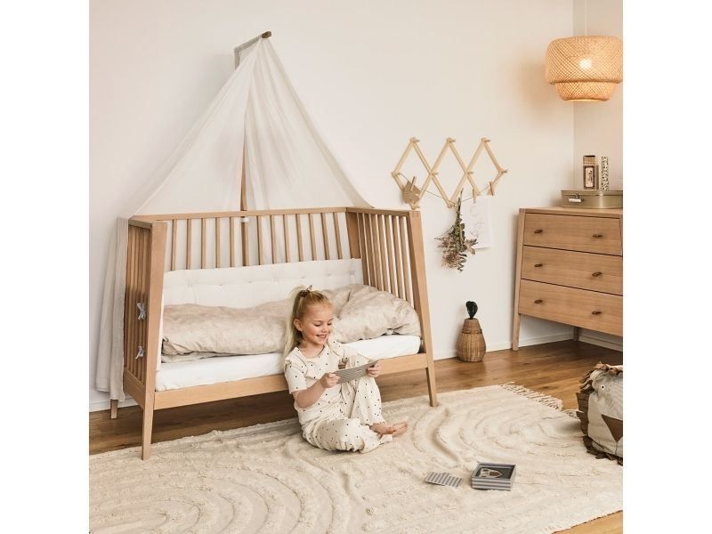 Dit barn har brug for masser af tryghed, særligt ved sengetid. Med Leander Linea™ babysengen får du et stilfuldt, nordisk designmøbel, der med smukke håndværksdetaljer og fokus på kvalitet giver dit barn en tryg base, når det er tid til at gå til ro. Sengen har fire fleksible indstillinger, så du kan bruge den i mange år. Start med at bruge tremmesengen med løftet bund og høje gavle. Det vil skåne din ryg, når du skal putte din baby. Når dit barn begynder at kunne rejse sig, anbefaler vi, at du sænker bunden. Når der ikke længere er brug for tremmerne, kan du fjerne sengens ene side, så dit barn selv kan kravle ind og ud af sengen. Når sengen er blevet for lille til at sove i, kan du lave den til en hyggelig, lille sofa. Babysengen med åben side må ikke benyttes som sideseng op ad forældresengen. Sengen er ikke godkendt som sideseng. Skab en hyggelig stemning på børneværelset og omkring sengen med smukke, farvekoordinerede tekstiler i Leander Linea™ serien. Her finder du sengerand, lagner og sengetøj, som du kan kombinere på kryds og tværs alt efter din personlige stil og smag. Madras, der sikrer optimal liggekomfort og ventilation fås separat.