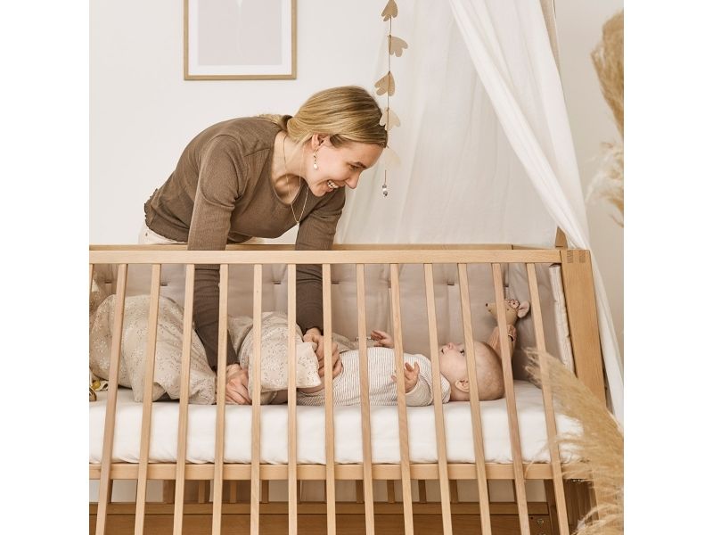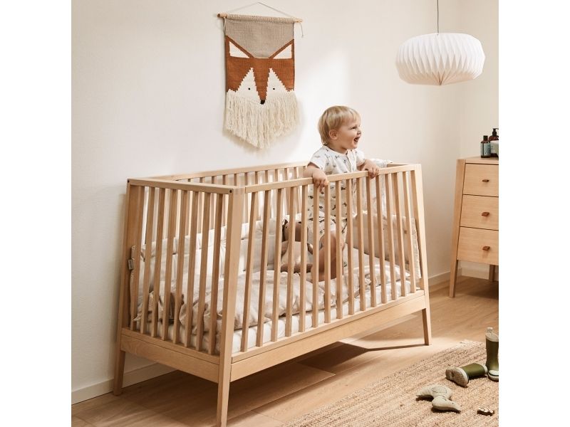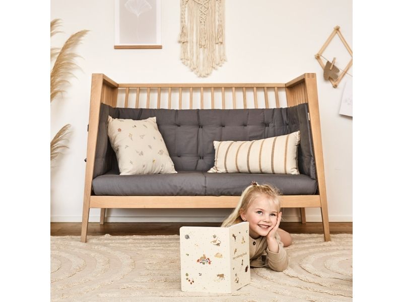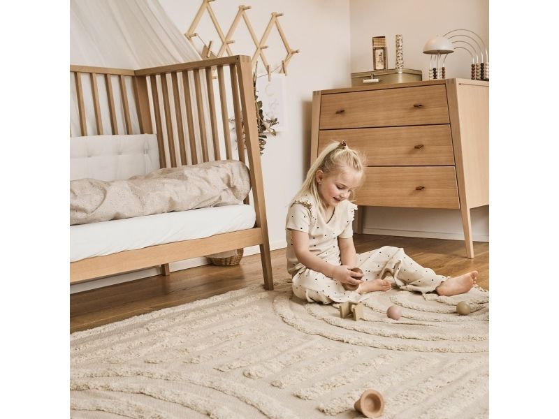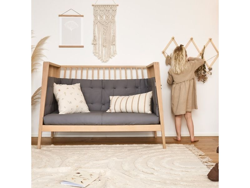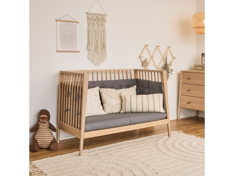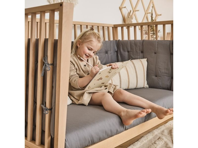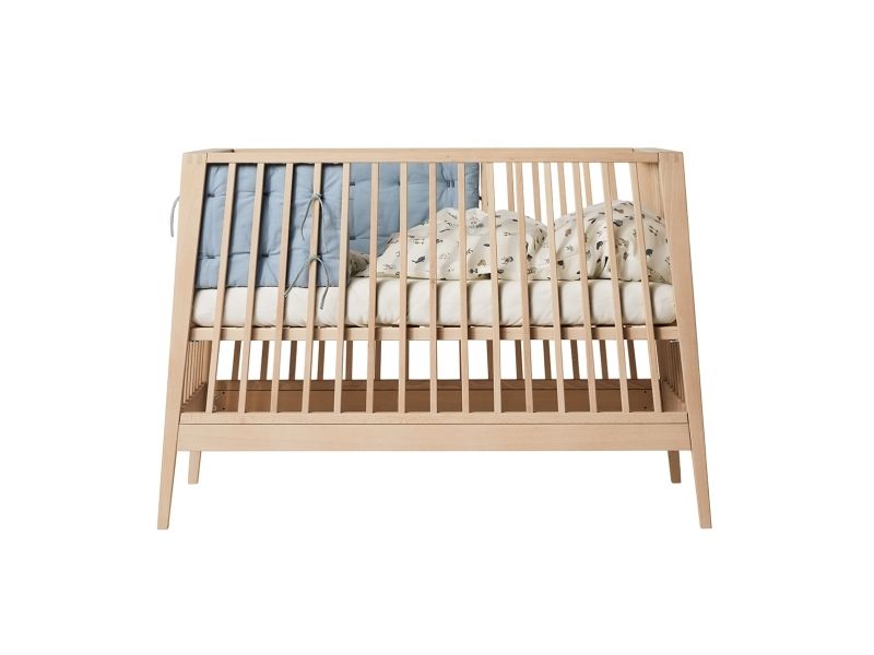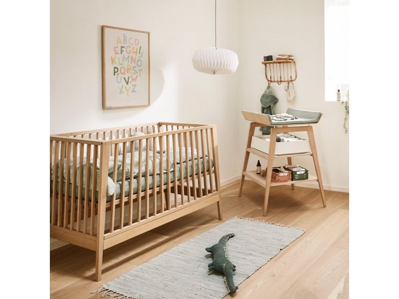 Dit barn har brug for masser af tryghed, særligt ved sengetid. Med Leander Linea™ babysengen får du et stilfuldt, nordisk designmøbel, der med smukke håndværksdetaljer og fokus på kvalitet giver dit barn en tryg base, når det er tid til at gå til ro. Sengen har fire fleksible indstillinger, så du kan bruge den i mange år. Start med at bruge tremmesengen med løftet bund og høje gavle. Det vil skåne din ryg, når du skal putte din baby. Når dit barn begynder at kunne rejse sig, anbefaler vi, at du sænker bunden. Når der ikke længere er brug for tremmerne, kan du fjerne sengens ene side, så dit barn selv kan kravle ind og ud af sengen. Når sengen er blevet for lille til at sove i, kan du lave den til en hyggelig, lille sofa. Babysengen med åben side må ikke benyttes som sideseng op ad forældresengen. Sengen er ikke godkendt som sideseng. Skab en hyggelig stemning på børneværelset og omkring sengen med smukke, farvekoordinerede tekstiler i Leander Linea™ serien. Her finder du sengerand, lagner og sengetøj, som du kan kombinere på kryds og tværs alt efter din personlige stil og smag. Madras, der sikrer optimal liggekomfort og ventilation fås separat.