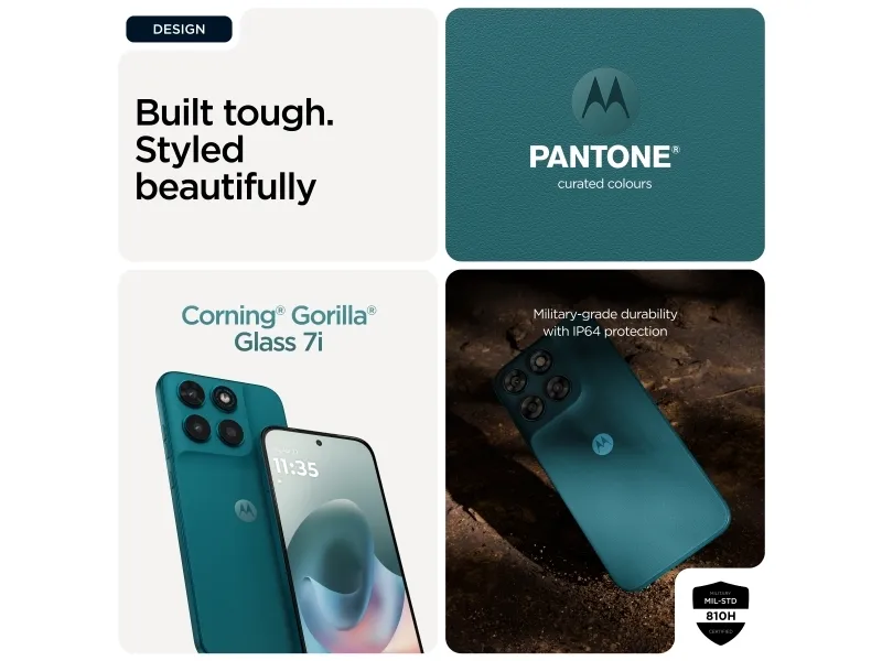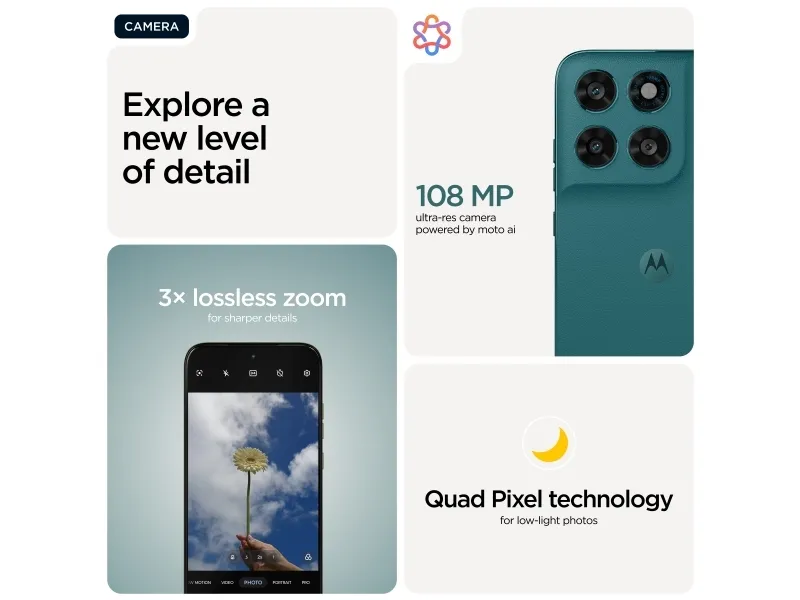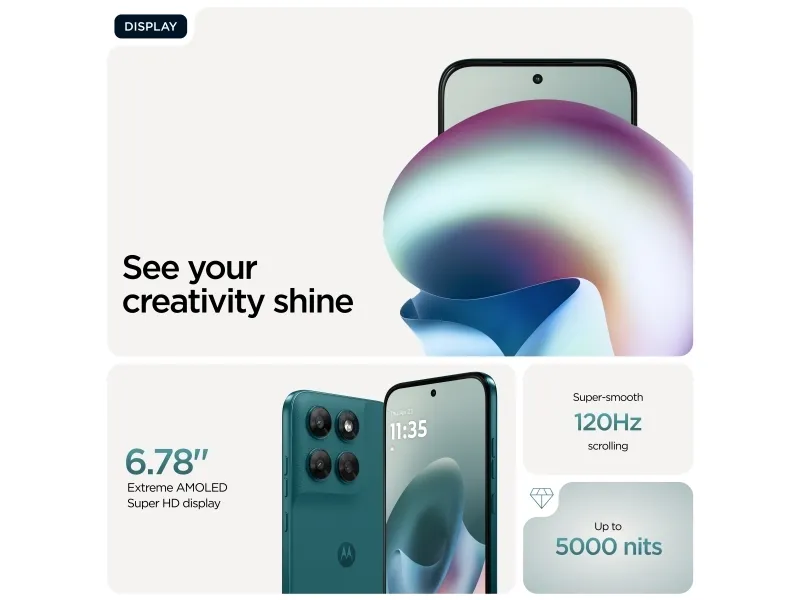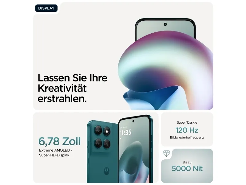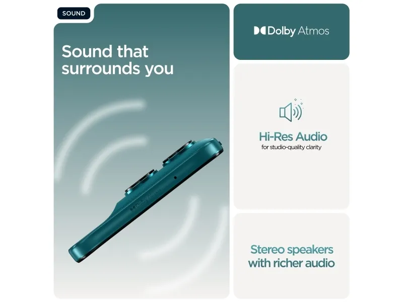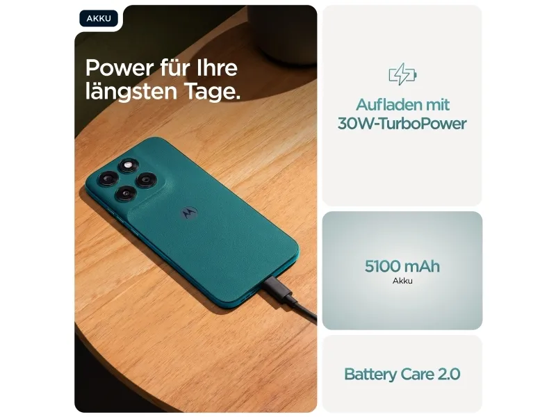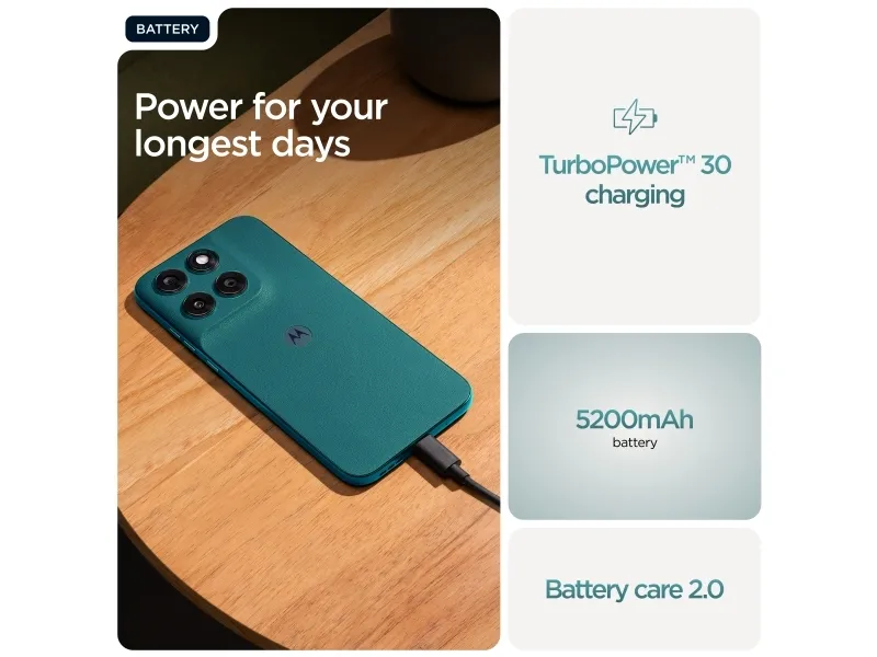 Doble stereohøyttalere, To mikrofoner, Gesture Controls, Family Space, Moto Unplugged, Smart Connect, moto ai, RAM Boost 4.0, Battery Care 2.0, Circle to Search
