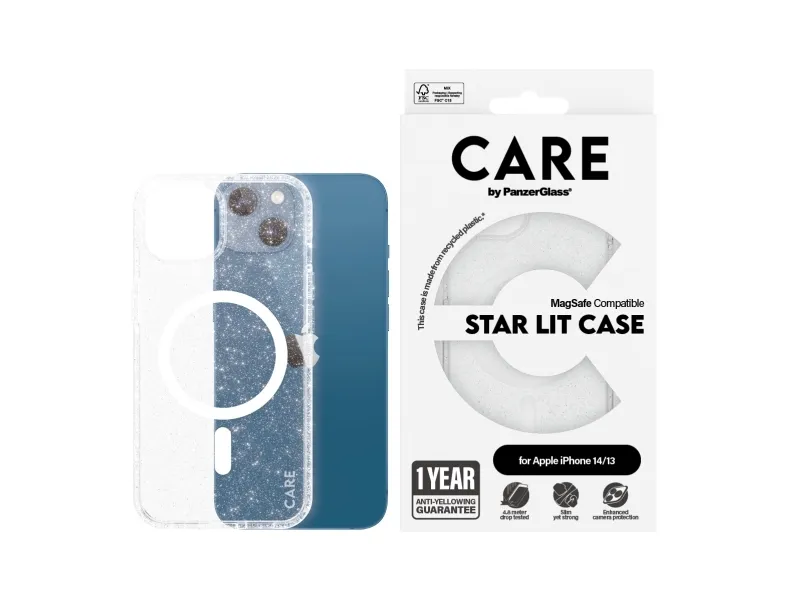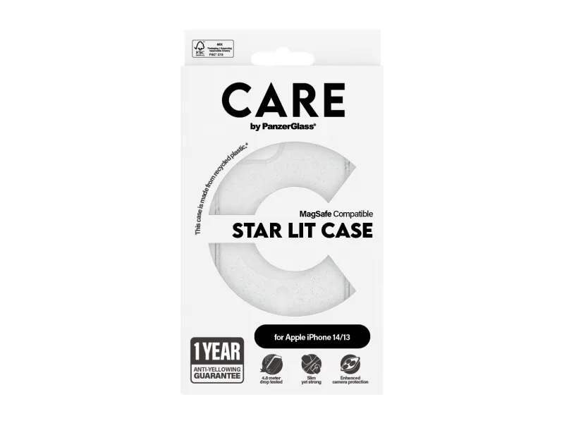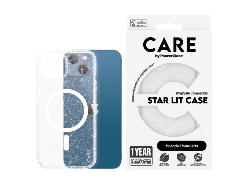 One of our most popular cases, offering phenomenal, eye-catching protection for the red carpet and those unforgettable glittery nights. Every angle and corner has been drop tested at 4.8 meters. The Star Lit case, made from recycled plastic, is designed for wireless charging and MagSafe compatibility. And it comes with our 1 Year Anti-Yellowing guarantee – no questions asked. Shine like a diamond with this beautiful Star Lit case and enjoy superior protection against drops and accidents whenever, wherever. It even includes enhanced camera protection, so your selfies and photos will always shine.? DARE TO CARE? CARE is a playful, protective international tech and lifestyle brand featuring a range of products created using the highest quality materials and influenced by fashion, art, and music. We care about people and the world we live in. We care about sustainability and self-expression. And we care about tech and extending its lifetime. So protect you tech in style and show the world you CARE.