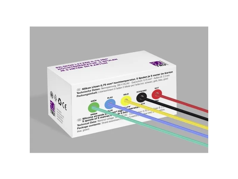 Silikone-strenge 0,75 mm² højtemperatur, 5 spoler hver 5 meter i karton Særligt blød, temperaturbestandig silikonetråd Driftstemperatur: -60 °C til 200 °C