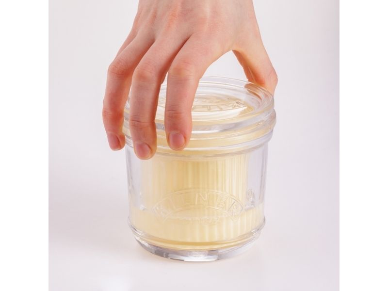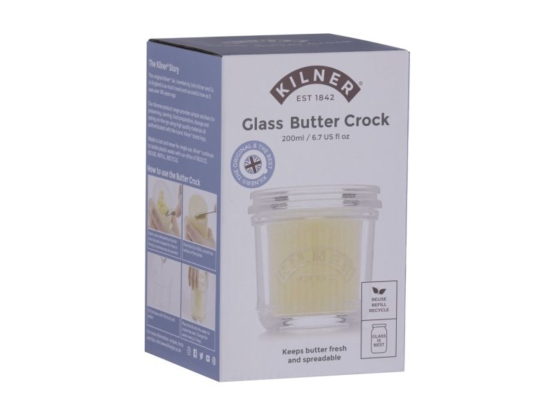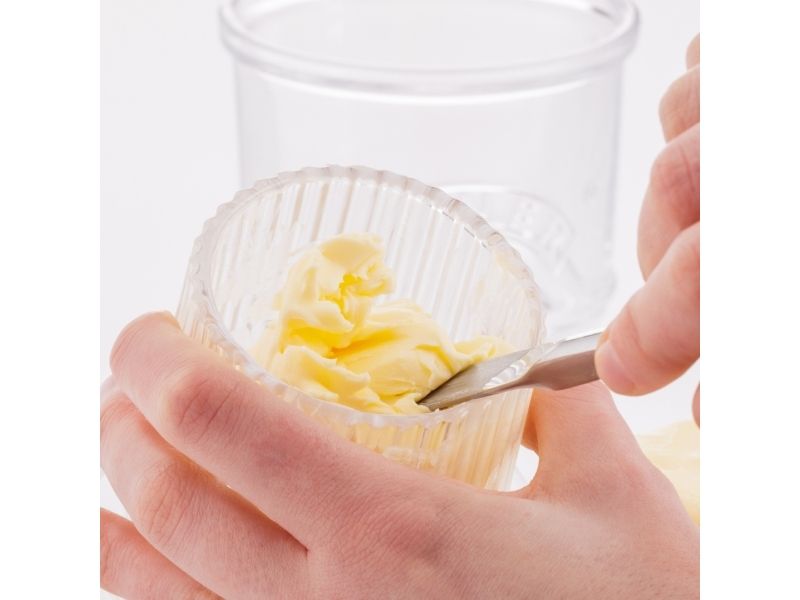 Med hjælp fra det smarte design har du altid smørbart smør ved hånden, og med glassets design kan du se, hvor meget smør der er tilbage. Varmen udefra isoleres af beholderen, og vandet, du fylder beholderen med, bidrager til kulden, så smørret i uret bevarer den perfekte konsistens, men også holder sig frisk i ugevis. Uret tåler opvaskemaskine. 10,8x10,5x17cm.