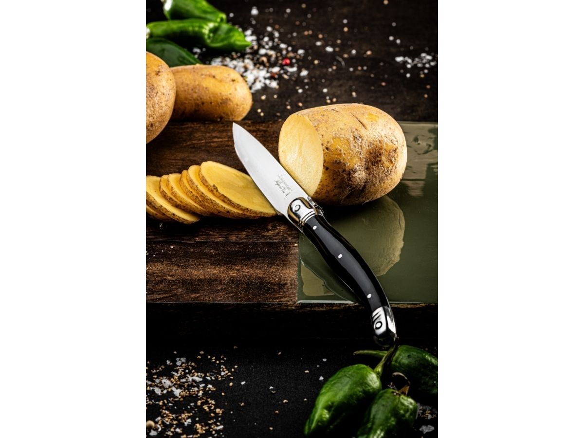 Skrælleknive er uundværlige i køkkenet! Laguiole Style de Vie 3-delt køkkenknivsæt tilbyder komfort og præcision! Dette sæt indeholder en dressingkniv, en tomatkniv og en dressingkniv. Du bruger dressingkniven til groft at skrælle grøntsager og frugt. Den buede bladform gør også kniven ideel til f.eks. at skrælle et æble. Med tomatkniven kan du nemt skære alle typer tomater. Skrællekniven er køkkenets allrounder. Du bruger den til at hakke krydderurter, skære og skrælle grøntsager eller endda trimme kød. Hver kniv er lavet af materialer af høj kvalitet og designet til maksimal komfort. Gør mad