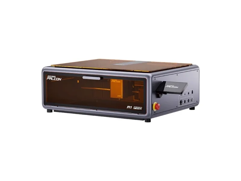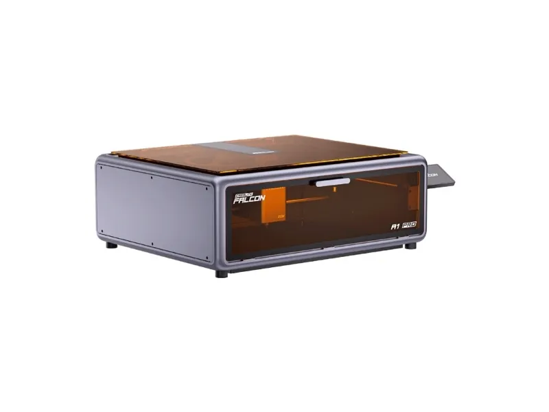 Despite its large working area, the Falcon A1 Pro stands out for its space-saving design, taking up significantly less space than devices with similar capabilities. Its dimensions of 567 × 468 × 211 mm allow it to fit easily into almost any workspace. The large double window provides excellent visibility of the process without the need for protective goggles, and the filtration system ensures comfortable viewing. The integrated smart touch screen provides quick access to file history, a clear view of the process, and a clear workflow. You can watch the laser work directly on the screen and launch tasks from the app with a single touch.