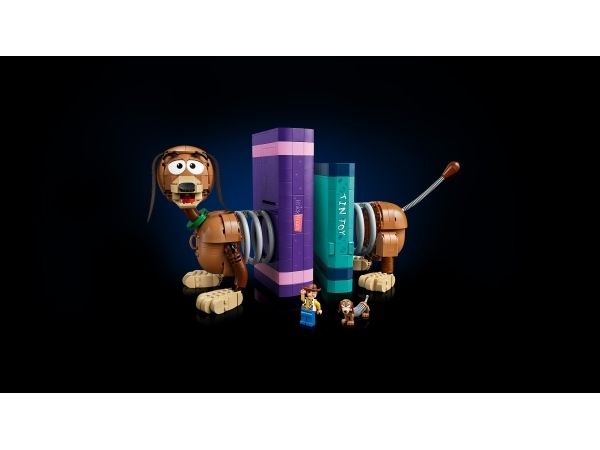 3. SKRIVEBORDSPYNT – byggesettet lar deg stille ut Slinky Dog på to måter: festet til de byggbare bøkene som bokstøtter, eller stående for seg selv. Han har dessuten bevegelig hode og hale, og labbene kan justeres litt