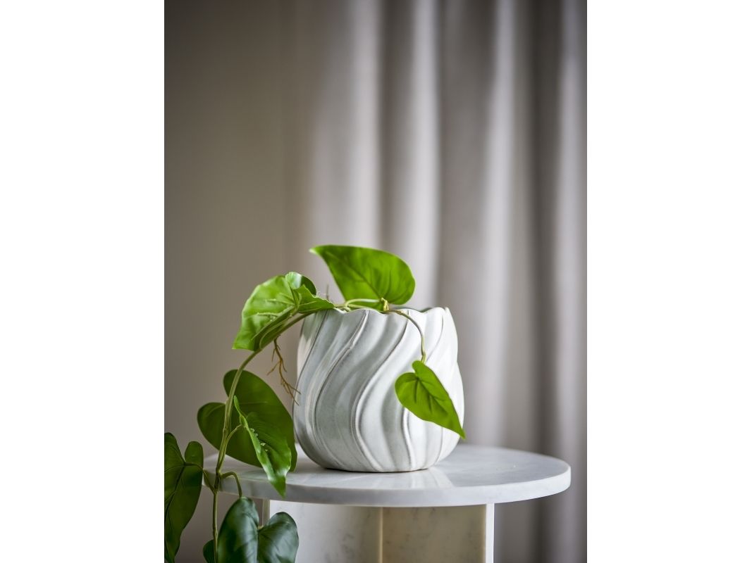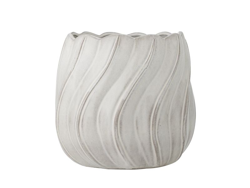 Isidora Urtepotteskjuleren fra Bloomingville er lavet af stentøj med en hvid, reaktiv glasur. Den bølgede overflade giver et levende udtryk, og små variationer i farve og finish kan forekomme som en naturlig del af materialet.