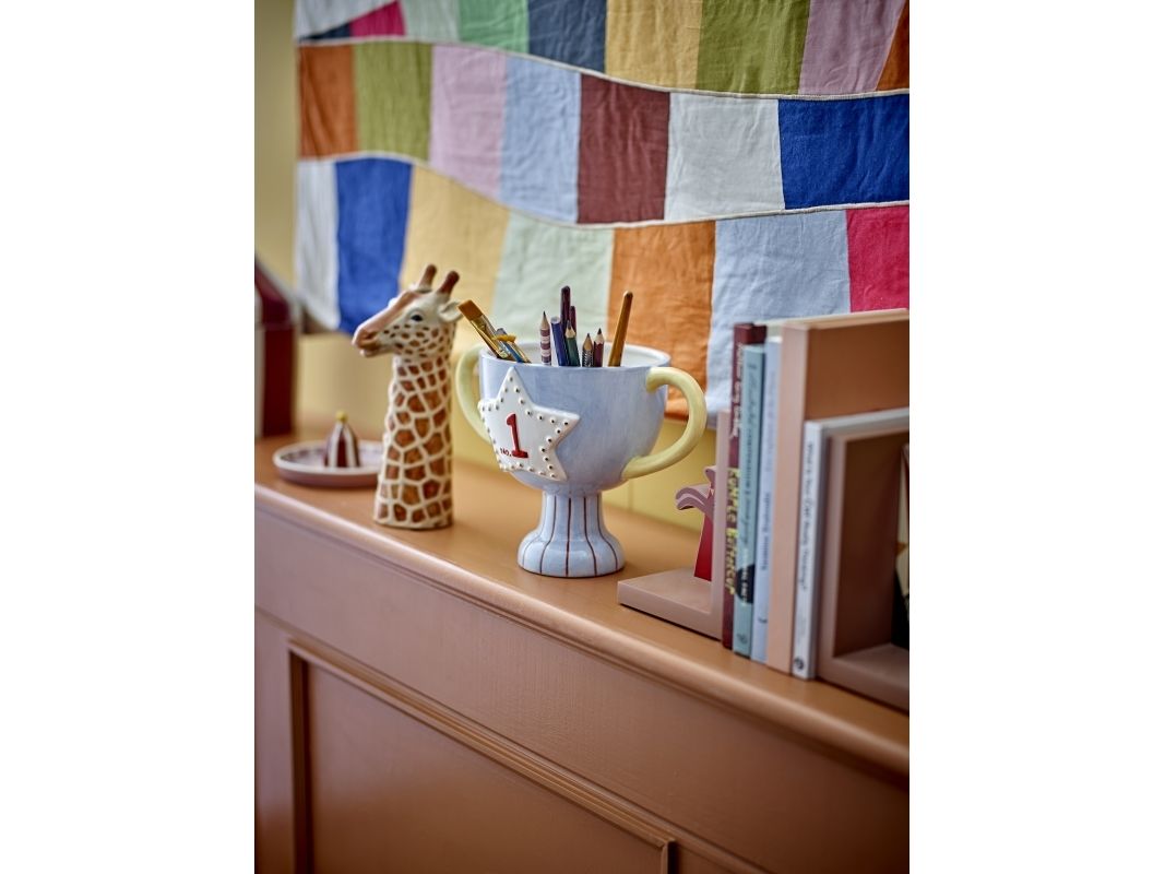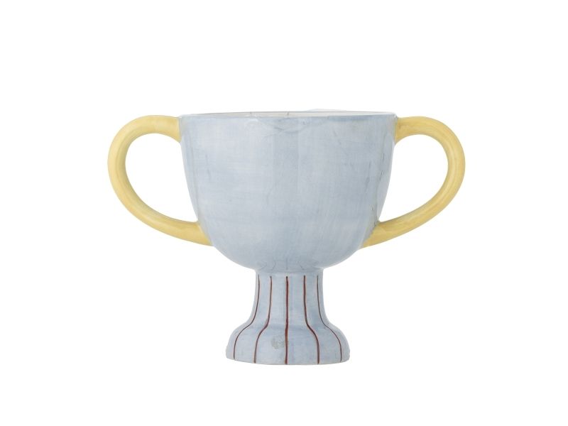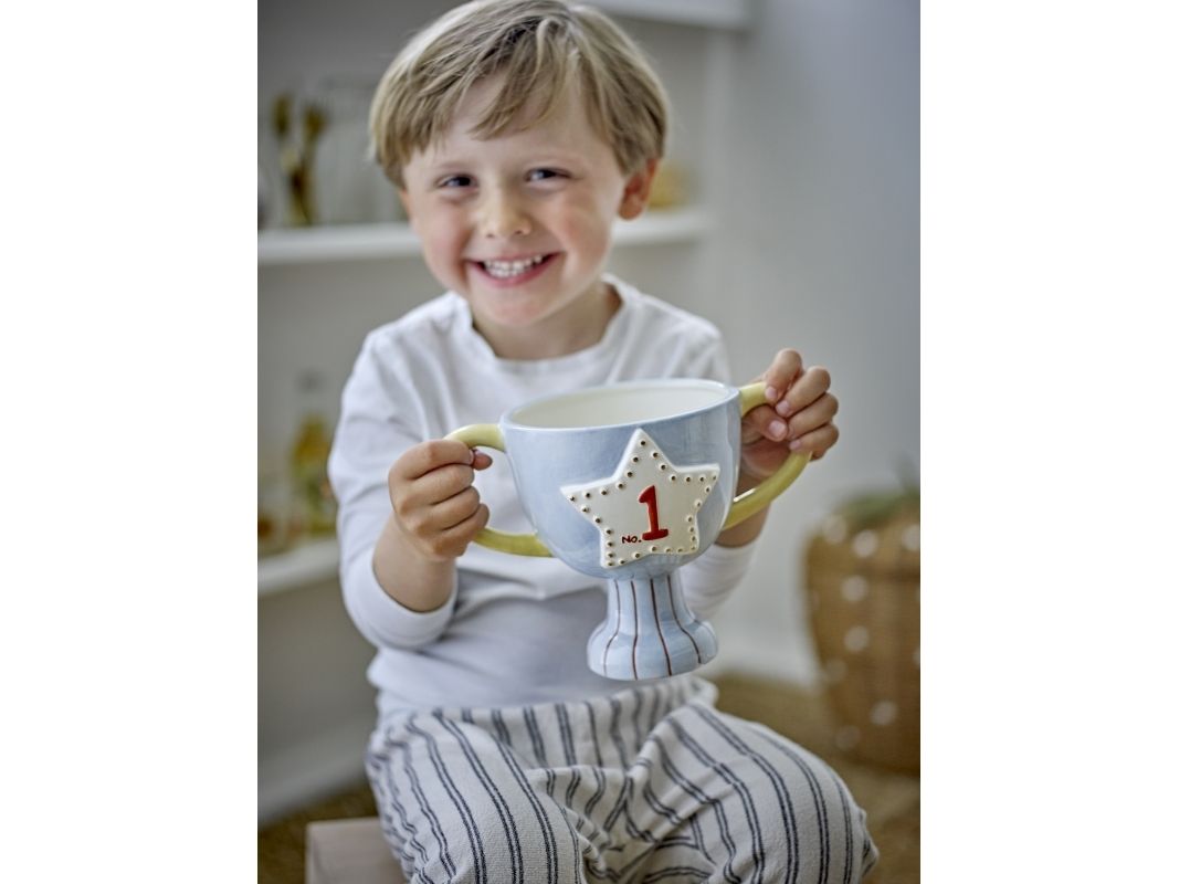 Trophy Urtepotteskjuleren fra Bloomingville MINI er lavet af keramik og formet som en pokal med to hanke. Den lyseblå skjuler har en stjerne og teksten “No. 1” – en sjov og dekorativ detalje til børneværelset.