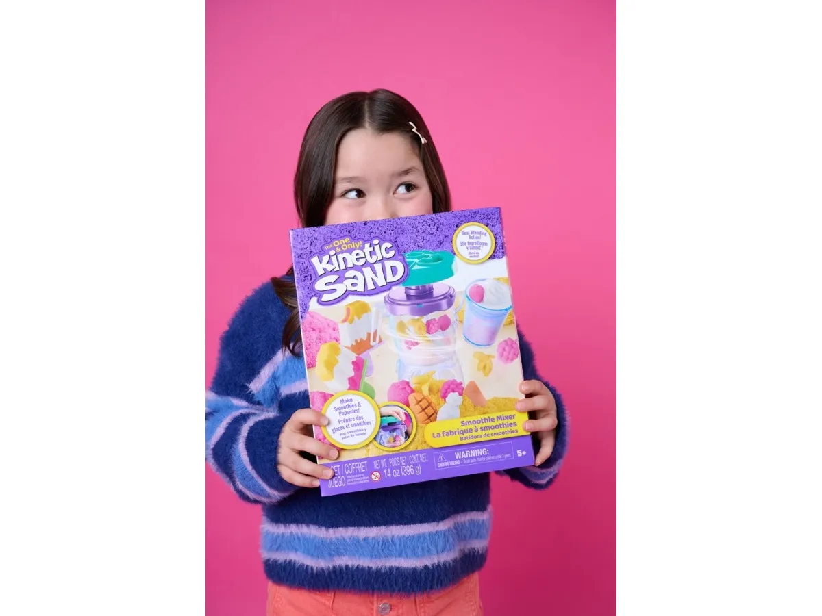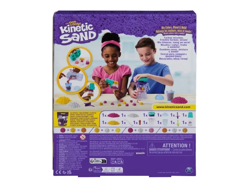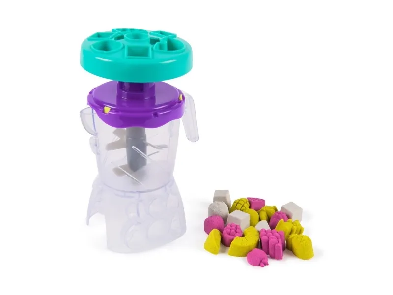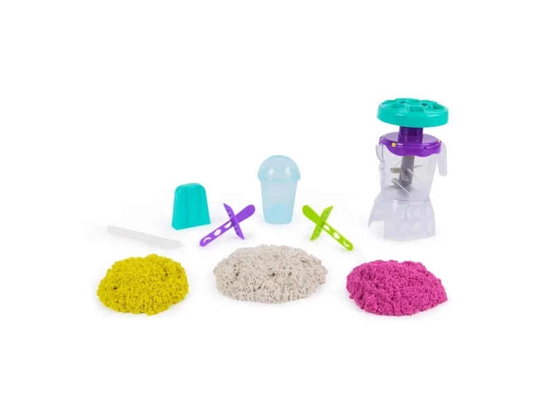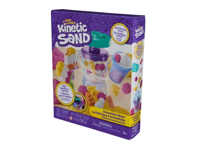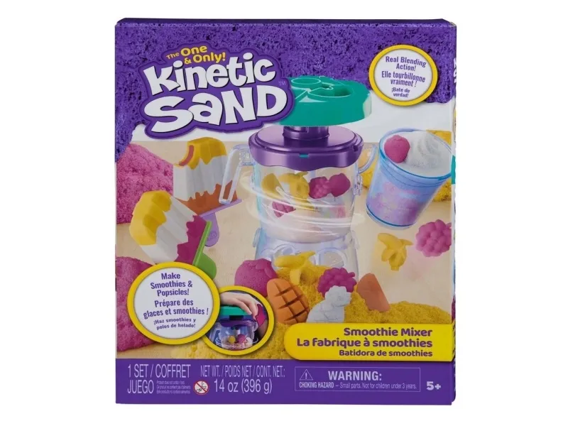 Lag fruktige godbiter med Kinetic Sand Smoothie Mixer. Med dette morsomme settet kan barn forme, stable, blande, skjære og klemme sammen sine egne smoothies og ispinner – og la kreativiteten blomstre! Barna får oppleve ekte blandingsaction når de former frukt og topping på lokket, slipper ingredienser i krukken og presser for å mikse – akkurat som en ekte mikser. Med 400 g lekesand kan du “helle” smoothieskaperverkene i koppen for servering, eller fylle ispinneskjemaet med lag av fargerik sand. Kinetic Sand fremmer finmotorikk og sensoriske ferdigheter, og passer både for individuell og gruppelek – og oppmuntrer til sosialt samspill. En må-ha-gave til bursdager, høytider eller enhver anledning – Kinetic Sand er et engasjerende alternativ til modelleire og byggesett. Kinetic Sand-sett kan også brukes som læringsressurs i klasserommet, som Montessori-leker eller for lek hjemme. The One and Only Kinetic Sand er laget av naturlig sand, tørker aldri ut og fester seg bare til seg selv – for enkel opprydding. Dypp hendene i sanden med flere farger av Kinetic Sand og oppdag flere lekesett (selges separat). Opplev ekte blandingsaction med Kinetic Sand Smoothie Mixer.