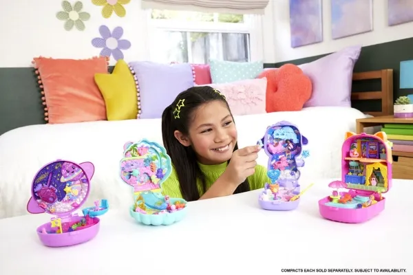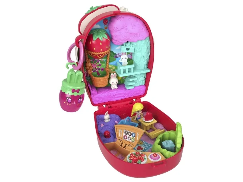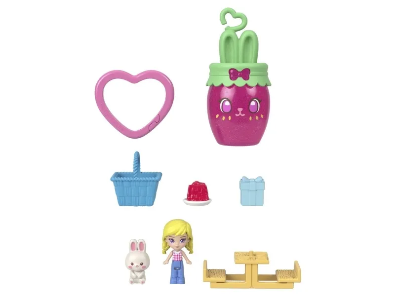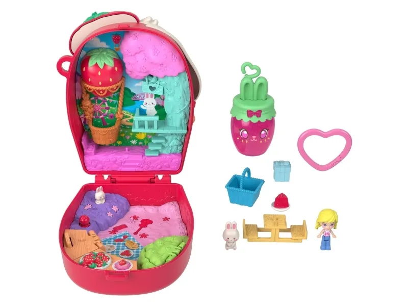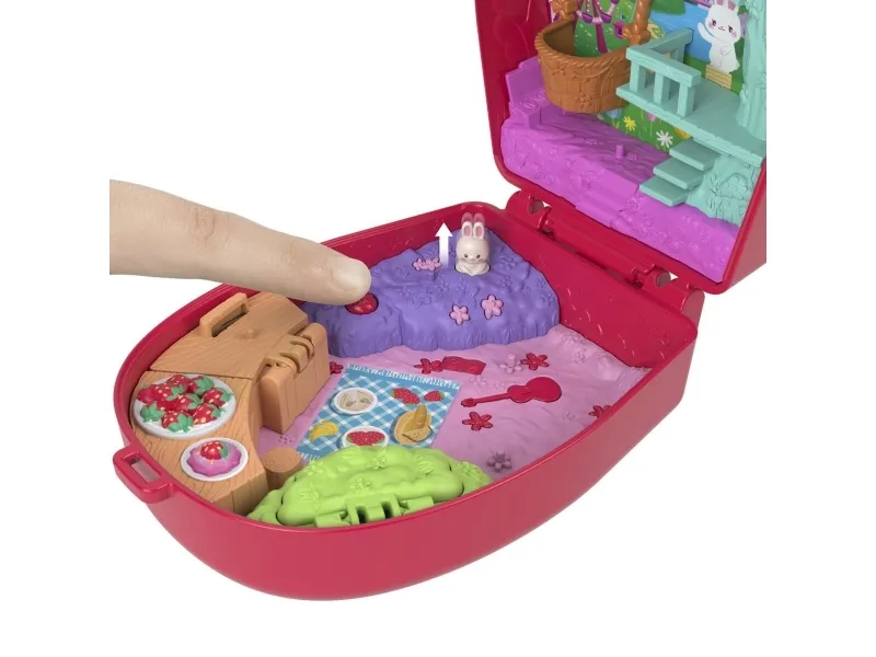 Formet som en kanin som ligger i en kurv med jordbær, beveger denne søte Polly Pocket Picnic Bunny Compact øret når du trykker på potene! Åpne kompaktet for å oppdage et jordbærinspirert eventyr! Hopp inn i leken med én mikrodukke og 8 tematilbehør, inkludert én kjæledyrkanin. Ta en tur i den svingende jordbærballongen! Gjem tilbehør i skattejaktbusken eller ha piknik ved bordet – det er så mye å gjøre! Når det er tid for å dra, pakk det sammen for moro på farten! Passer for barn fra 4 år og oppover, spesielt de som elsker kanintema. Med forbehold om tilgjengelighet. Farger og dekorasjoner kan variere.