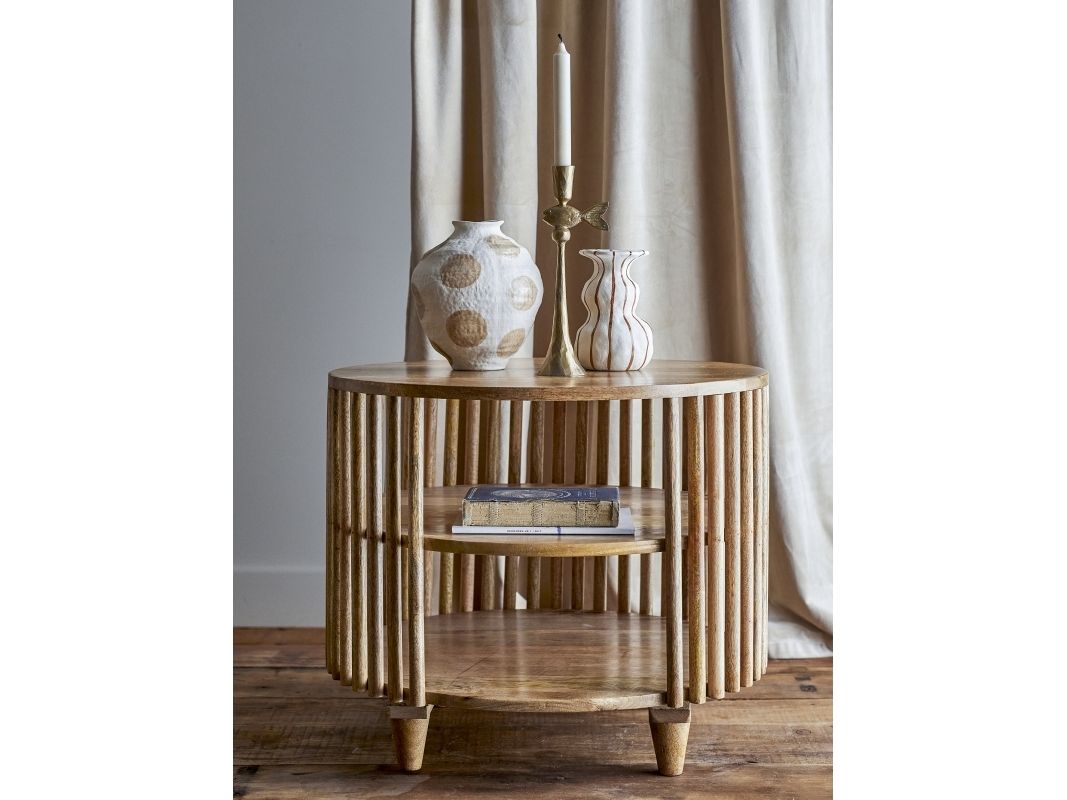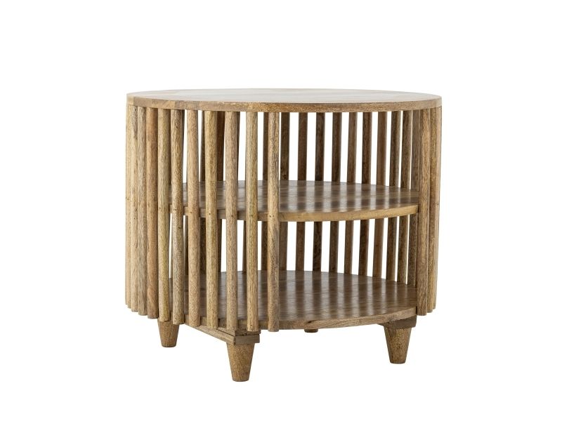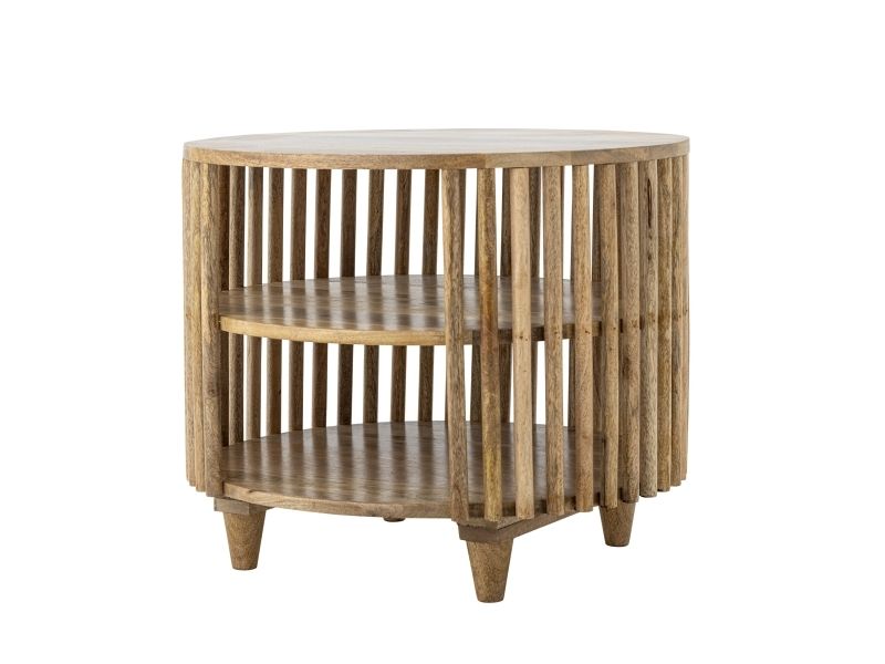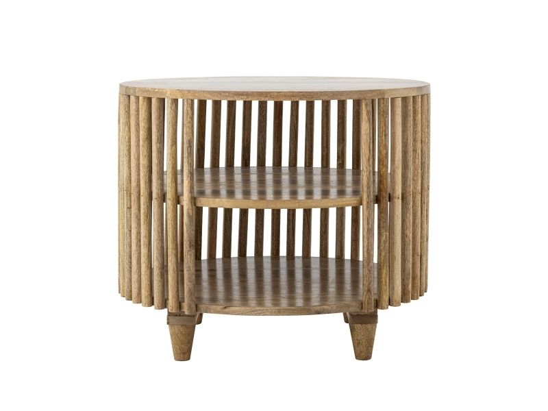 Sali Sofabordet fra Creative Collection er et rundt bord i FSC®-certificeret mangotræ med en lakeret overflade. Det har lameller på siderne, to hylder nederst og slanke, tilspidsede ben i en varm brun tone. Da det er lavet af naturmaterialer, kan farven variere, så hvert bord er unikt.