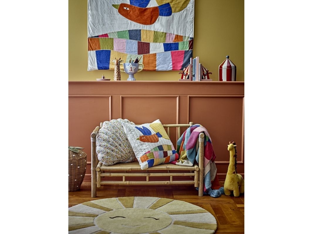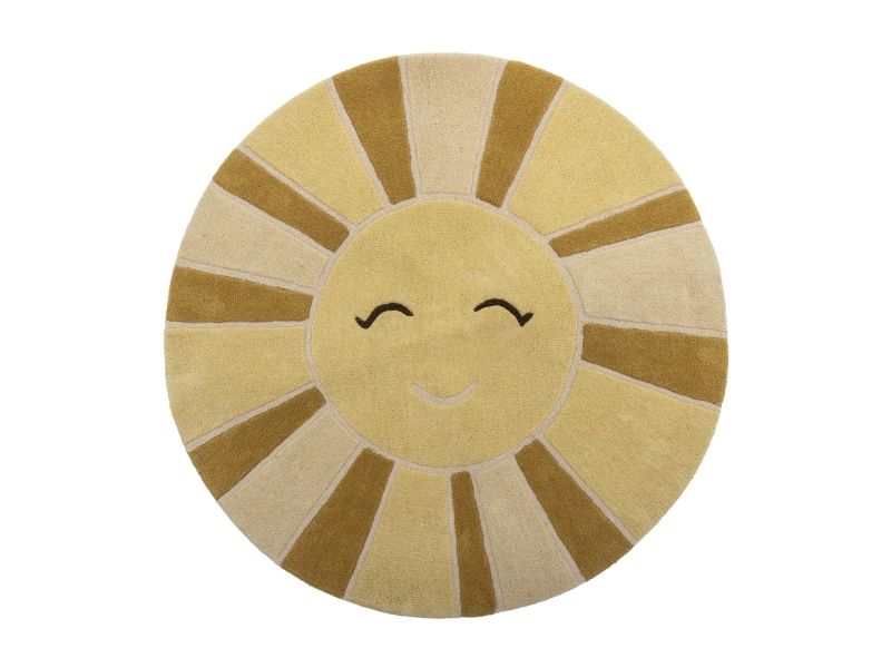 Sun Tæppet fra Bloomingville MINI er lavet af uld og har et rundt design med et venligt solmotiv. De varme nuancer og det bløde udtryk gør tæppet til en hyggelig tilføjelse til børneværelset.