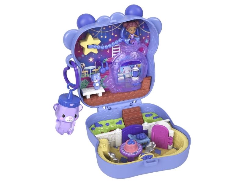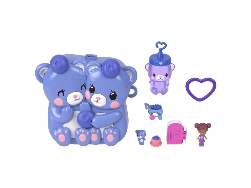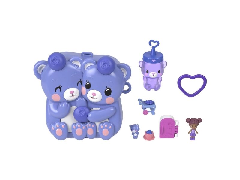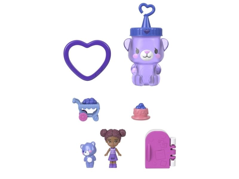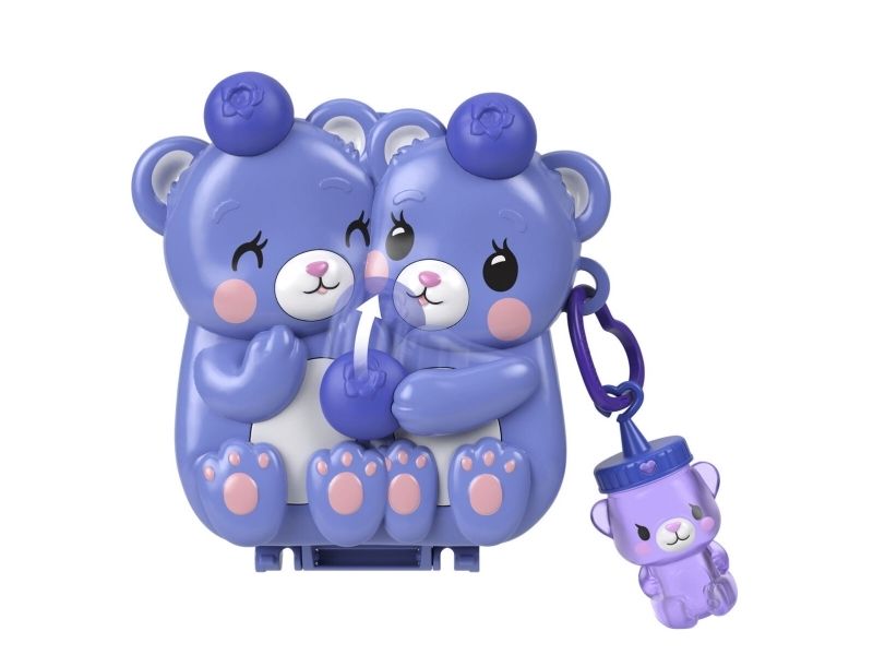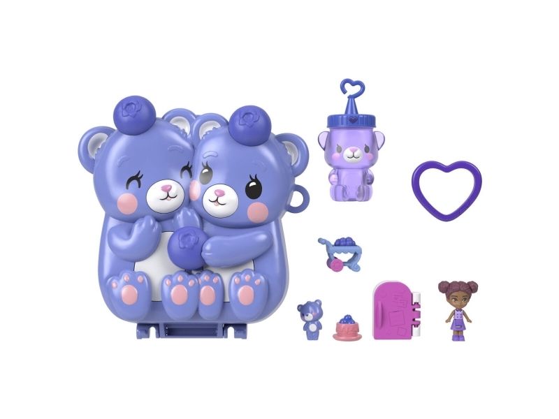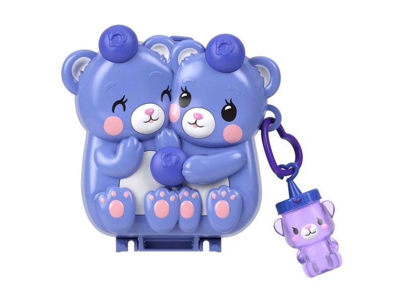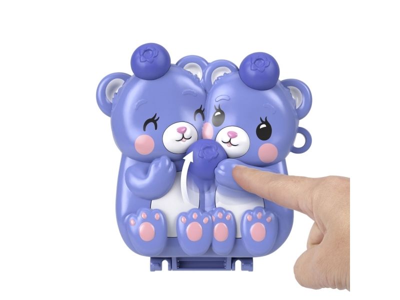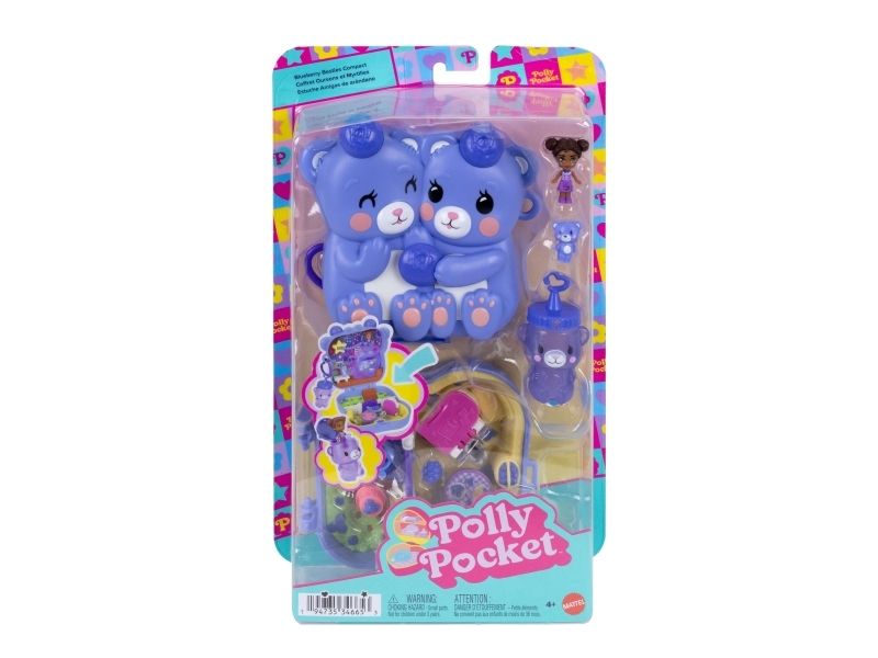 Åh, mine poter – en av de søte Polly Pocket Blueberry Besties på utsiden av kompaktet kan løfte armen for å mate den andre bjørnen! Åpne lekesettet for å oppdage et blåbærbjørn-inspirert eventyr! Hopp inn i leken med én mikrodukke og 8 tematilbehør, inkludert én bjørneunge. Ta en tur fra toppen av sirupsflasken! Sving i roterende stoler mens du spiser bær fra kjøleskapet som kan åpnes – det er så mye å gjøre! Når det er tid for å dra, pakk det sammen for moro på farten! Passer for barn fra 4 år og oppover, spesielt de som elsker å henge med sin bestevenn. Med forbehold om tilgjengelighet. Farger og dekorasjoner kan variere.