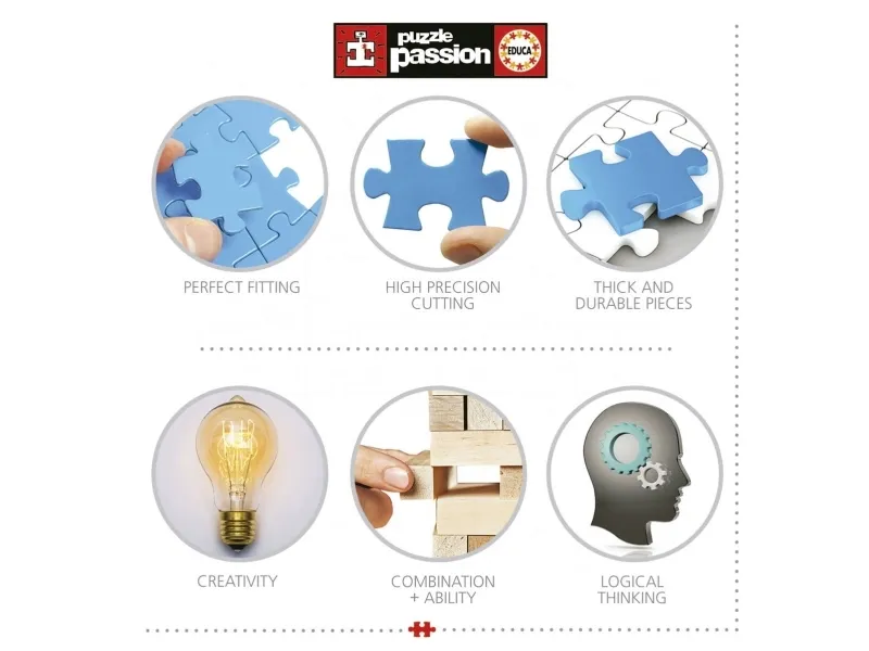 Puslespill med 1000 brikker. Educa® tilbyr det mest komplette utvalget av puslespill for voksne på markedet, med størrelser fra 500 til 42 000 brikker og med de beste bildene og mest underholdende motivene. Omtrentlig størrelse på ferdig puslespill: 68 x 48 cm.