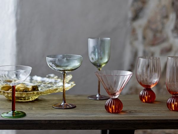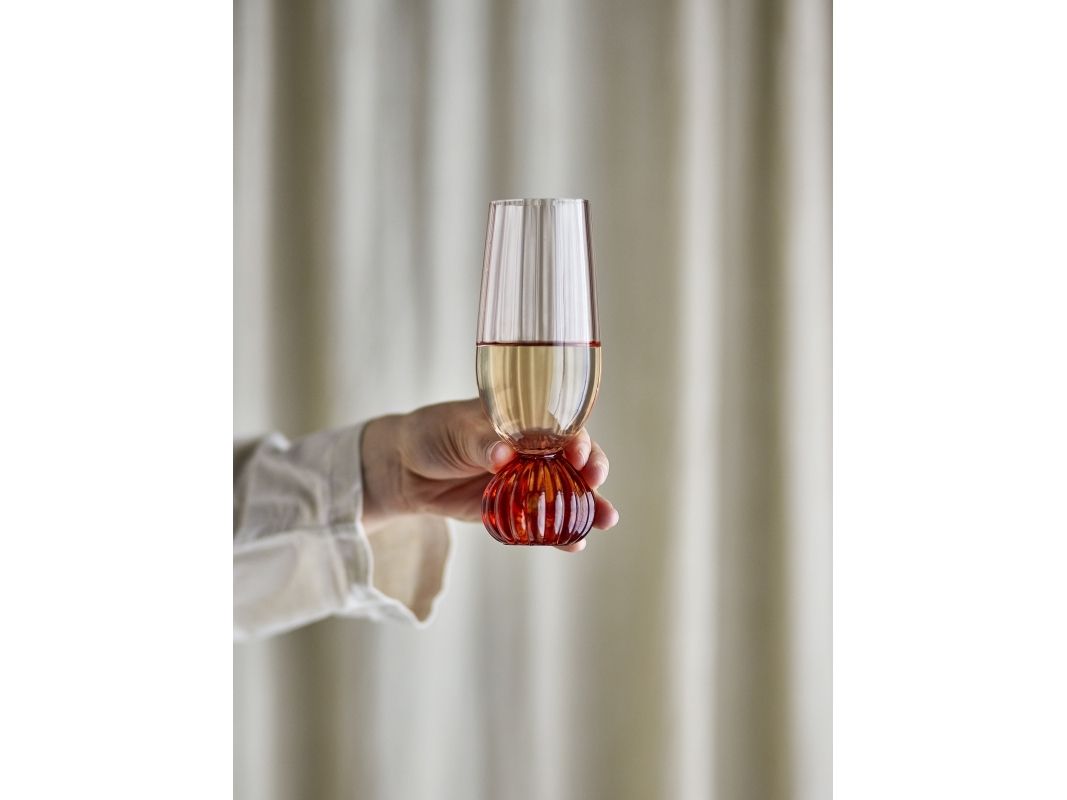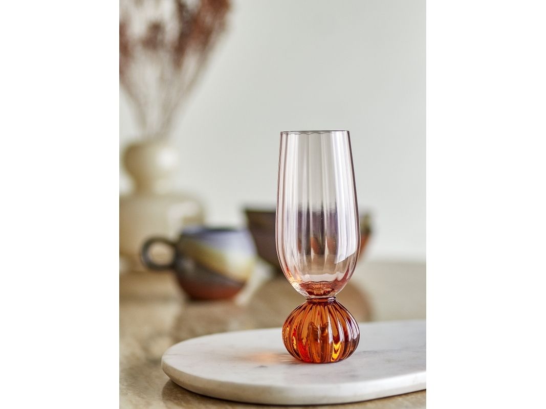 Taurin Champagneglasset fra Bloomingville har en kuppel med fine riller, en rillet base og en afrundet fod. Det er udført i en blid rosa nuance, og da glasset er mundblæst, kan der forekomme små variationer i størrelse, farve og udtryk – detaljer, der giver hvert glas sit helt eget præg.