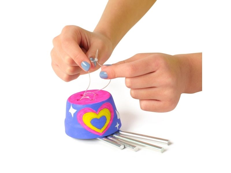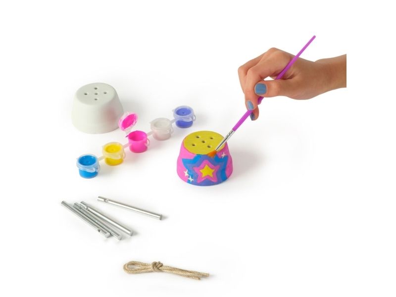 Bli en hverdagsskaper med Cool Maker Stilige Vindspill Malingssett. Dette komplette settet inneholder alt barn trenger for enkelt å lage og designe sitt eget vindspill, inkludert maling, en pensel, leirpotter, bjeller og snor. Det er enkelt å designe: mal hver potte, tre bjellene, og stable deretter pottene sammen med snoren. Med fem farger å velge mellom kan barn mikse og matche farger og bruke fantasien til å tilpasse vindspillet akkurat slik de vil. Når det er ferdig, vis det frem og heng det opp på soverommet for å høre de magiske klokkelydene. Enten du ser etter morsomme aktiviteter for barn til overnattingsfester, bursdager, skolestart, regnværsdager eller hverdager, er Cool Maker-hobbysett for barn et flott tilskudd til perlesett, hobbyutstyr og kreative kits. For flere måter å skape med Cool Maker på, se etter Stack’d Heishi Armbåndsmaskin og andre sett som BFF Perler, Hjerteformet Håndveske og mer (selges separat). Mal ditt eget vindspill med Cool Maker Stilige Vindspill Malingssett.