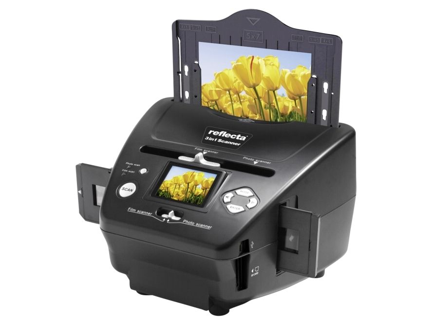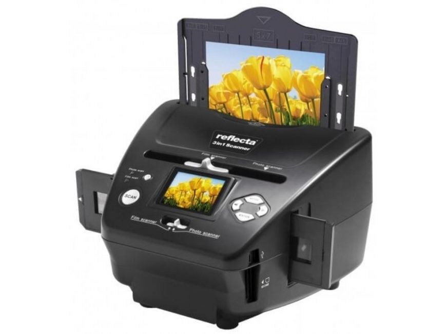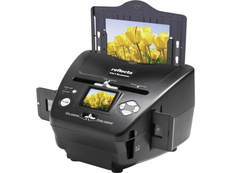 The reflecta 3in1 Scanner is a true multitalent. The device does not only allow for quick digitizing of slides and negatives, but also printed pictures. Photographs up to a size of 13x18 cm can be migrated to the digital age in a matter of seconds. Brightness and color are automatically optimized during the scan, although both can be individually adjusted as well. This standalone device has an SD card slot, as well as an integrated display for image control. The USB connection enables the transfer of the image files to a PC.