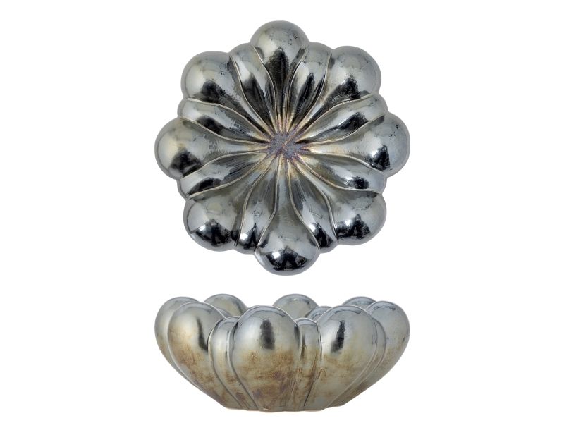 Sheeran Skålen fra Bloomingville er fremstillet af stentøj med en glansfuld sølvfinish og en blød, organisk form. Den blomsterlignende silhuet tilfører et elegant udtryk til enhver indretning.