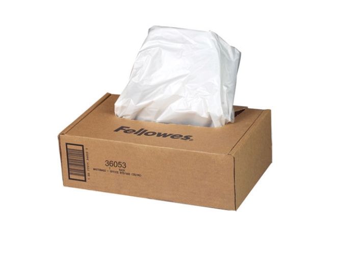 Powershred Waste Bags for Fellowes shredder waste receptacles. Convenient bags keep work areas clean, and include easy-to-use dispenser box with extra-long wire ties.