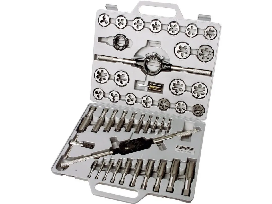 Gevindskæresæt, 45 dele Skærebakke-adaptere · Snitbakkeholder · Skruetrækker · Vindejern M6 - M25 · Optagelse · Skærejern: M6 x 0,75/M6 x 1/M8 x 1/M8 x 1,25/M10 x 1,25/M10 x 1,5/M12 x 1,5/M12 x 1,75/M14 x 1,5/M14 x 2/M16 x 1,5/M16 x 2/M18 x 1,5/M18 x 2,5/M20 x 1,5/M20 x 2,5/M22 x 1,5/M22 x 2,5/M24 x 1,5/M24 x 3,0 · Gevindbor: M6 x 0,75/M6 x 1/M8 x 1/M8 x 1,25/ M10 x 1,25/M10 x 1,5/M12 x 1,5/M12 x 1,75/M14 x 1,5/M14 x 2,0/M16 x 1,5/M16 x 2/M18 x 1,5/M18 x 2/M20 x 1,5/M20 x 2/M22 x 1,5/M22 x 2/M24 x 1,5/M24 x 3 · Plastkuffert. Skærebakke op til M 24 snittap op til M 24