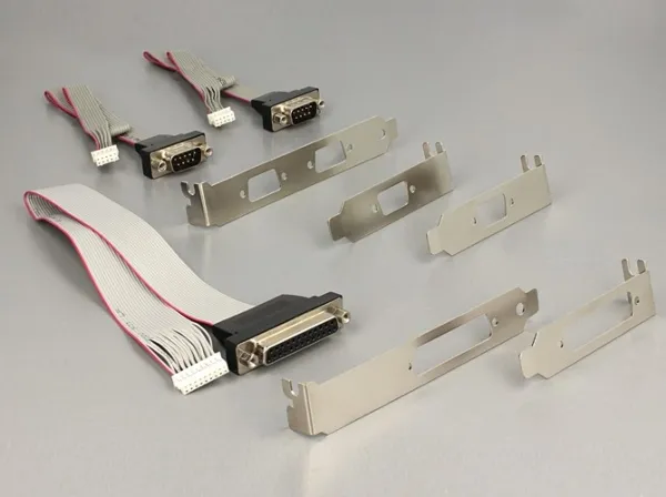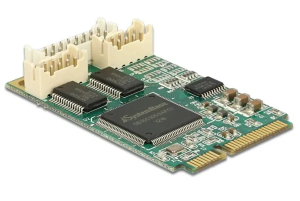 This MiniPCIe adapter by Delock expands your system by two additional serial and one parallel port, which you can lead out through the slot bracket. You can connect different serial and parallel devices like printer, scanner, modem etc. to this adapter.\n- Connector:\non the module:\n2 x 10 pin pin header male (serial)\n1 x 18 pin pin header male (parallel)\non the slot bracket (standard) 2 x:\n2 x serial RS-232 DB9 male with screw nuts\n1 x parallel male with screw nuts\nor on the slot bracket (low profile) 3 x:\n1 x serial RS-232 DB9 male with screw nuts\n1 x parallel male with screw nuts\n- Chipset: Systembase SB16C1053\n- Form factor: MiniPCIe full size\n- Interface: PCI Express revision 2.0\n- Data transfer rate up to 921.6 Kb/s\n- Compatible with 16C550 UART
