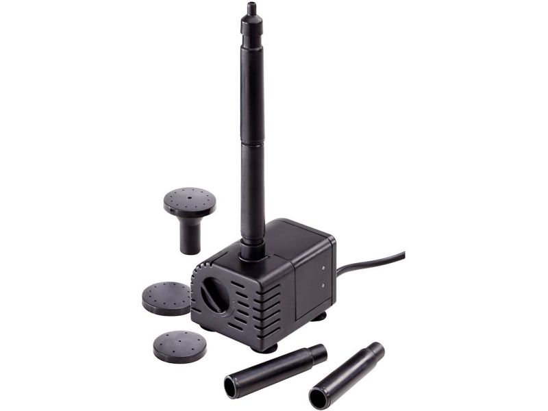 Kvalitetspumpe egnet til brug i den lille havedam, sammenplantning eller forsyning af små vandspyere. Vandpumpen er udført som nedsænkningspumpe og er udstyret med et slidstærkt elektronisk drev. Med de medfølgende stigrør og dysesættet kan der opnås 4 forskellige sprøjtebilleder. Pumpens ydelse kan indstilles. Drives med solcellepanel, DC-strømforsyning eller batteri - købes separat.