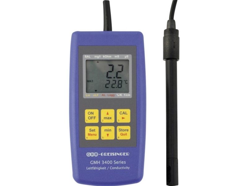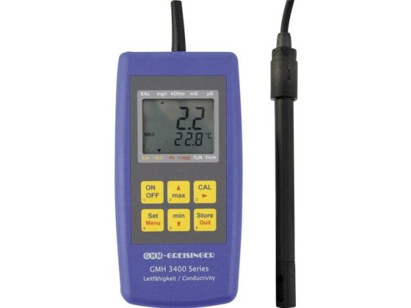 Ledningsevnemåler GMH 3431 Automatik-off-funktion · AutoRange · Visning af batteriskift · Holdefunktion · Hukommelse for min./maks. værdier Ledningsevnemåler inkl. 2 pols målecelle Salinitets-bestemmelse TDS-bestemmelse (filtra-tørhedstilstand)