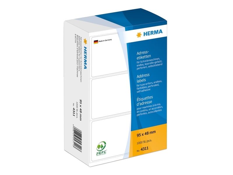 HERMA 4311, Hvit, Papir, Matte, 9,5 cm, 4,8 cm, 1000 stykker