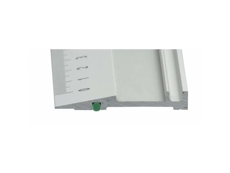 Skærelineal med facet. Skumtape på bagsiden forhindrer linealen i at glide. Når linealen vippes, er det muligt at bruge facetten som tuschkant. Den høje skærekant øger sikkerheden, mens man skærer.
