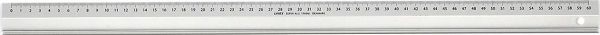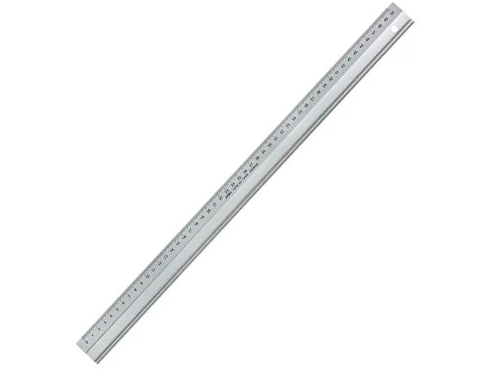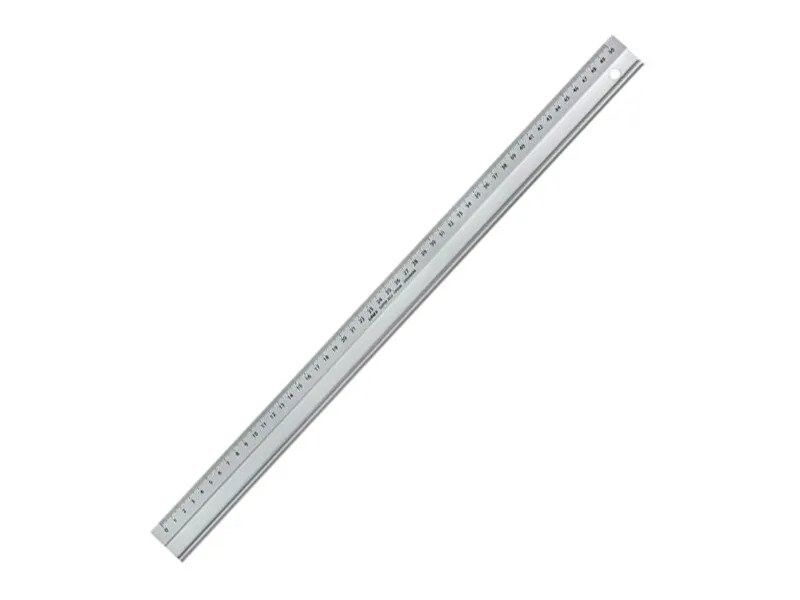 Skærelineal med facet. Skumtape på bagsiden forhindrer linealen i at glide. Når linealen vippes, er det muligt at bruge facetten som tuschkant. Den høje skærekant øger sikkerheden, mens man skærer.
