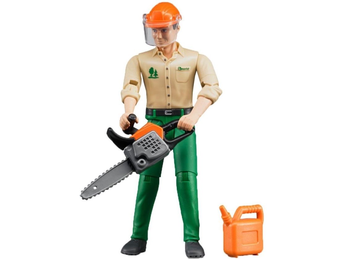 BRUDER's extensive range of products includes a great number of tractors, trailers and forestry equipment. Complementing this range in an ideal way are toy figures which add an element to the toy landscape that makes playing in it even more fun and realistic. The forest worker with accessories is the ideal supplement to any forestry equipment that is part of the product line. Just to be "safe", we included a hard hat with visor to allow the worker to start working right away. The set also includes a chain saw along with a fuel canister, allowing the children to imitate the day-to-day routine of a forest worker in as realistic a way as possible. The head as well as his arms and legs move, while his clothing matches the design of his real-world counterpart.