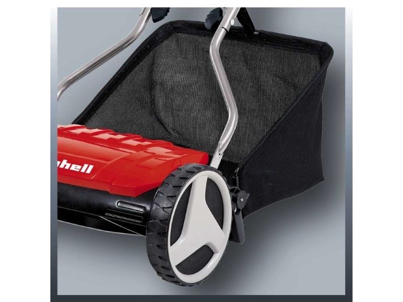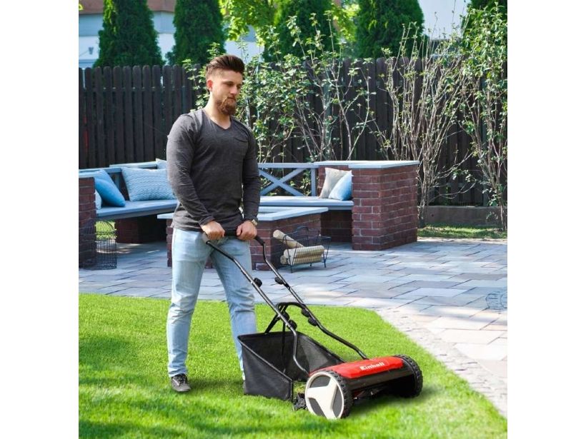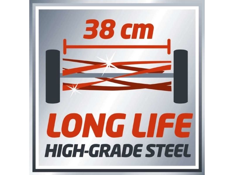 The manual lawn mower GE-HM 38 S-F is robust and functional equipment for any hobby gardener, with which smaller lawns can be mowed quietly, with ease, and in an environmentally-friendly manner. The special, contactless cutting technology facilitates the work immensely, as only low friction losses develop between the blade and the counter blade. Thus, not only the necessary energy expenditure reduces, but also the volume. The blades of grass are cut off deeply and cleanly. A fine lawn optics results, nearly as good as cut with shears. This high-quality cylinder mower has a smooth-running mowing spindle mounted in ball bearings with 5 precision-ground cutting knives from high-grade steel and enables an exact adaptation of the cutting height thanks to a four-level cutting height adjustment. The cutting technology of the GE-HM 38 S-F even enables results suitable for golf courses. The lawn mower is additionally equipped with a plastic running roller with a diameter of 50 mm and large-area, lawn-protecting wheels. Its grass catch box has a capacity of about 26 litres. This equipment is recommended for lawns up to to 250 m².