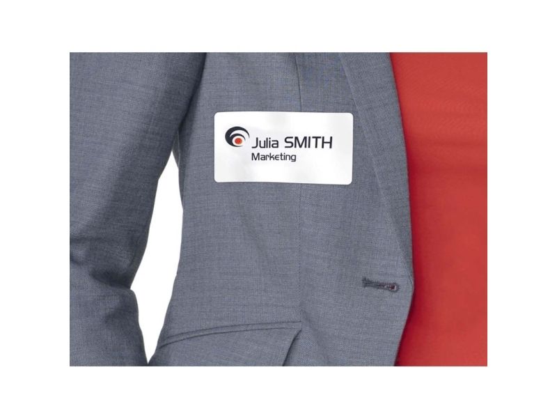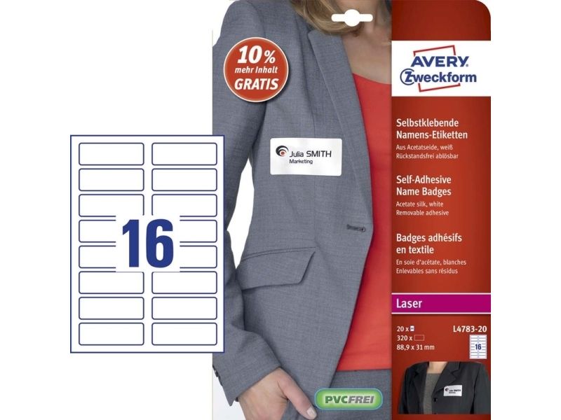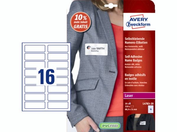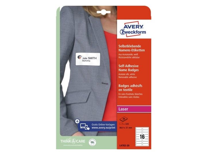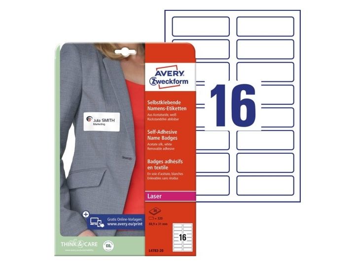 | • Klæber på tekstiler (undgå sarte tekstiler) • Fjernes nemt uden at efterlade mærker • Nem, professionel og praktisk navneskiltløsning • Elegant PVC-frit silkemateriale (Acetat) • Design og print nemt med GRATIS skabeloner |