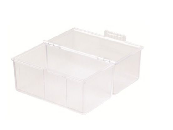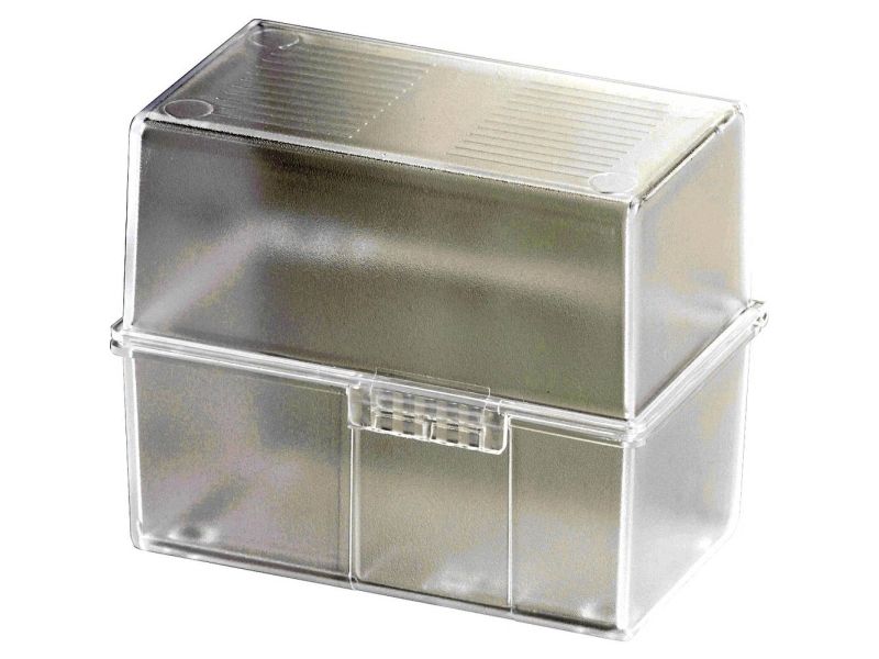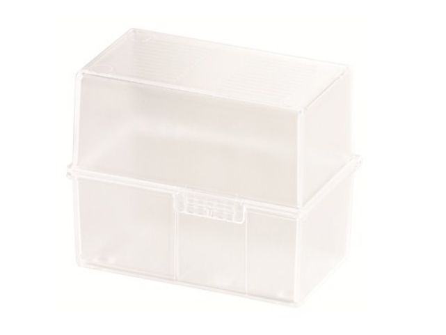 Kartotekskasse din A6 på tværs, til maks. 400 kort. Den ideelle ordenshjælper på kontoret og på farten. Udførelse i høj kvalitet med stålhængsel samt snaplukning. Låget kan klappes helt sammen og fungerer også som ekstra korttrug. Kapacitet: Fra 310 kort (190g/m²) til maks. 400 kort (100g/m²). Leveres uden indhold. Anvendelse til kortformat: Din A6 på tværs. Tilbehør valgfrit: Register A-Z din A6, tværs (best.-nr. 986). Udvendige mål (B x D x H) 165 x 95 x 128 mm. Materiale: Plast af høj kvalitet, polystyrol (PS). Farve: Translucent-klar