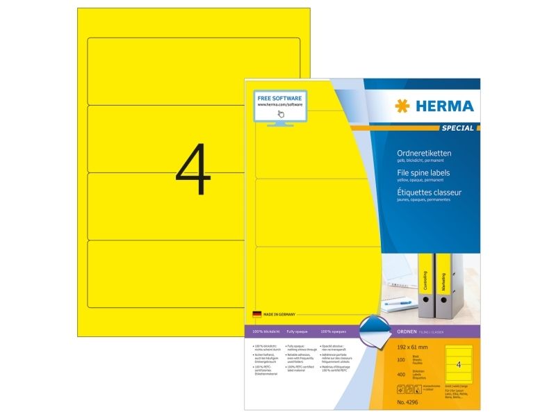HERMA Special - Papir - matt - permanent selv-adhesiv - gul - 192 x 61 mm 400 etikett(er) (100 ark x 4 opake arkivmappeetiketter