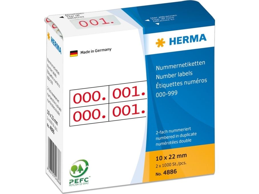 - Number labels self-adhesive made of white writing paper. Two labels 10 x 22 mm in one row with two identical numbers. Continuously numbered from 0 to 999. In a cardboard dispenser of 1000 duplicate numbers.