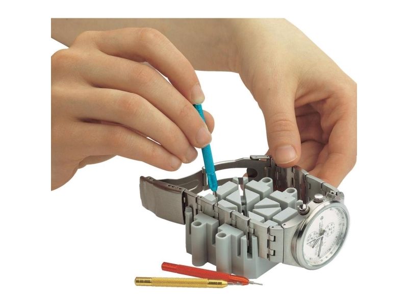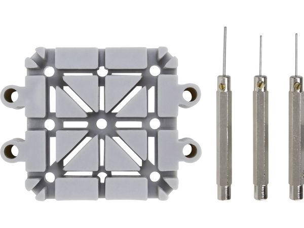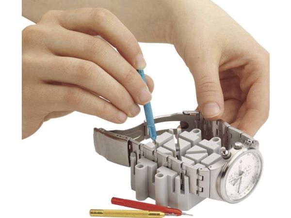 Remholdeblok af plast til forskellige båndtykkelser med fangspalter til stifterne · Stiftudtrykker med huller 0,6 - 0,8 og 1,0 mm dia. til i- og uddrivning af båndstifter.