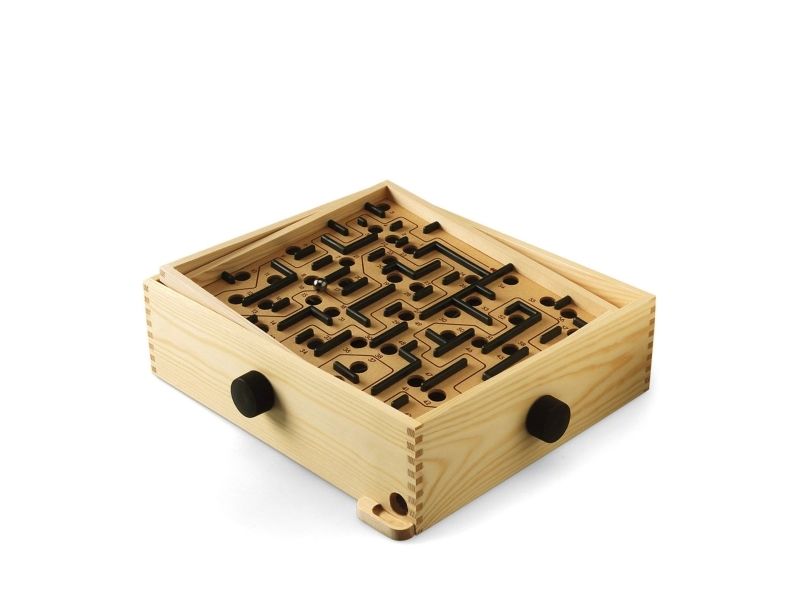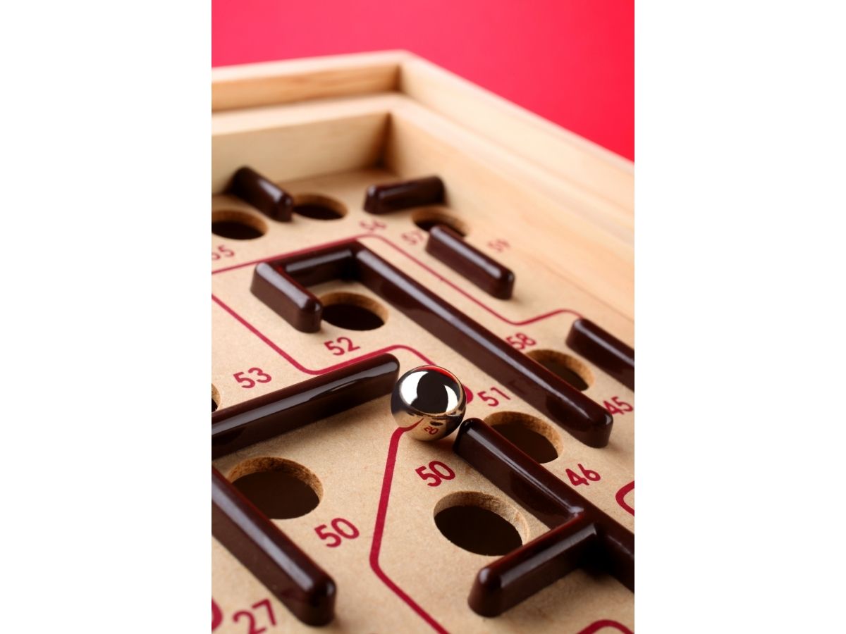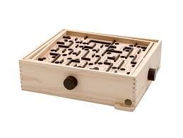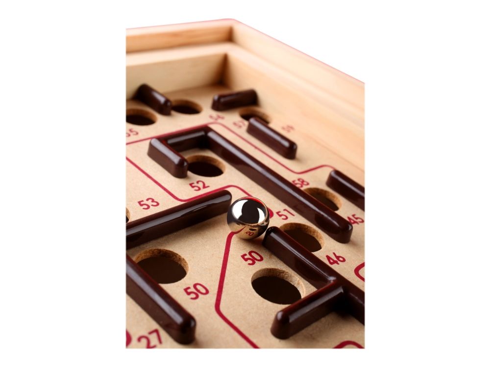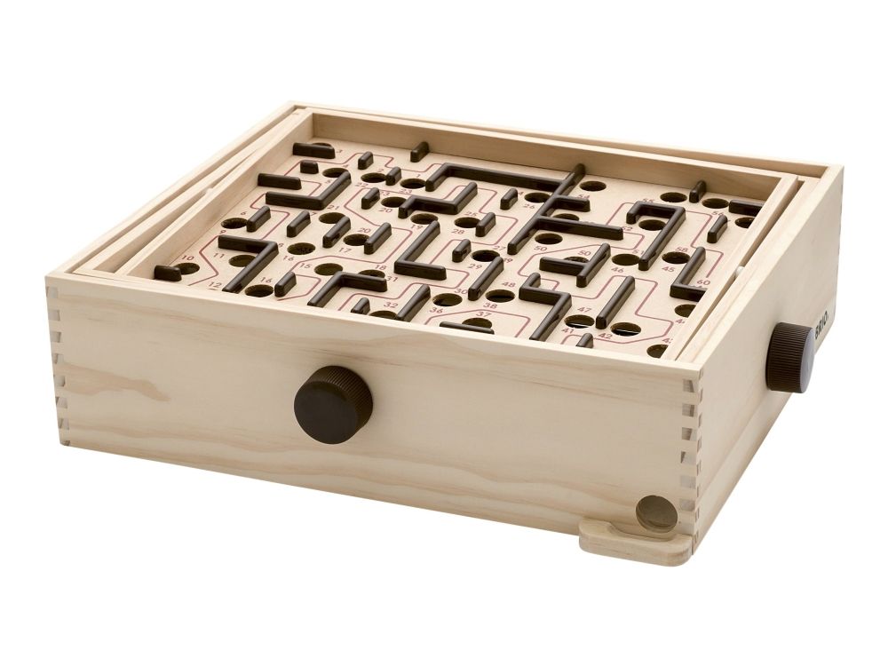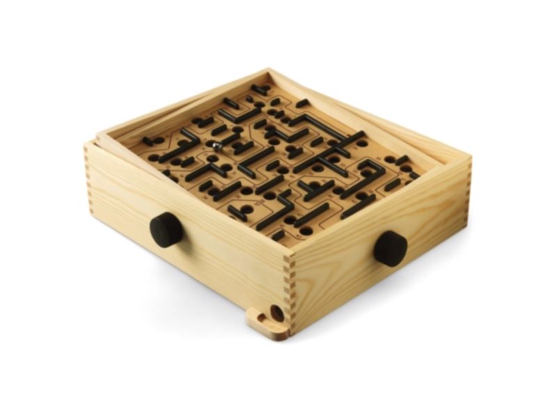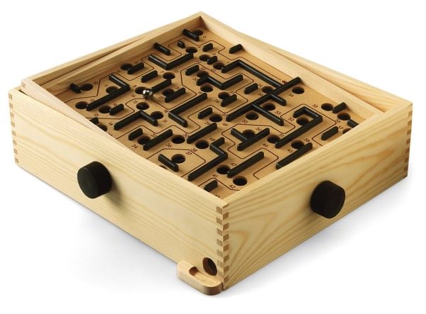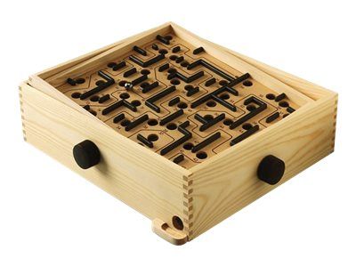 Hold tungen rett i munnen! Hvem kommer lengst? Bruk knottene på hver side av spillet til å påvirke stålkulens ferd gjennom trelabyrinten.