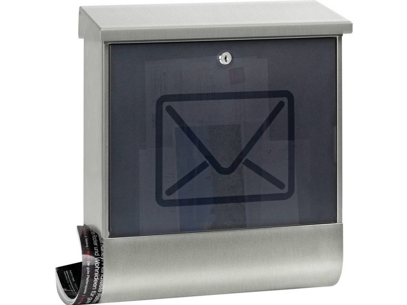 Rustfrit stålbrevkasser Lucenta 2700 Ni Med halvgennemsigtig plastikdør Indkastformat DIN C4 Rustfri Med ridsefast beskyttelseslak Indkast (B x H): 330 x 31 mm Under det opklappelige tag finder du avisrum og den rummelige postkasse.