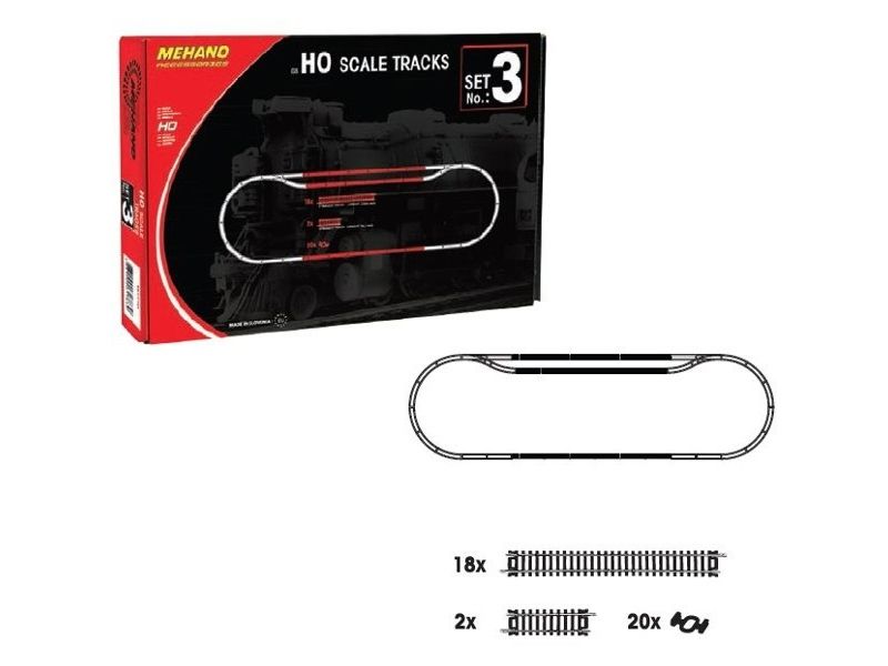 Sættet indeholder: lige spor spor 18 lige (à 228,6 mm) x 2 (à 76,2 mm) · 20 forbinder stropper.