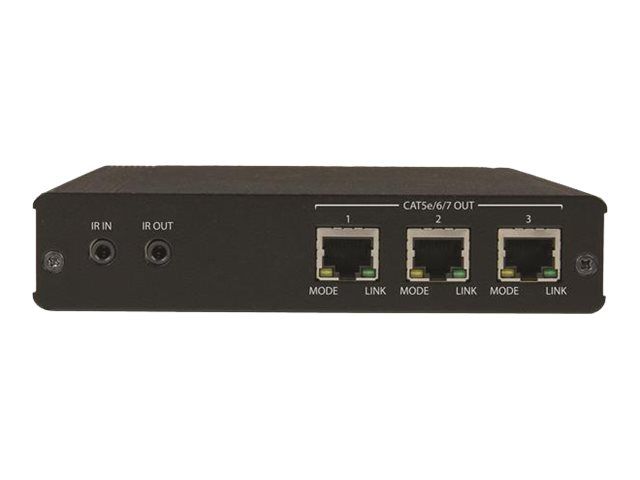 This 3-Port HDBaseT™ extender kit lets you extend an HDMI® source to three remote locations, using HDBaseT technology. The kit includes three remote receiver units, and the transmitter features a local HDMI output, which gives you the ability to keep a fourth HDMI display at your local video source.
