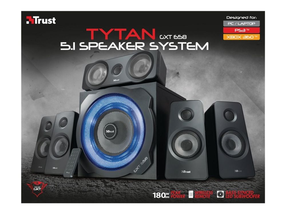 Eksplosjoner og brølende motorer har aldri hørt så ekte som nå. Trust Gaming GXT 658Tytan 5.1-høyttalersystemet gir deg all den kraften du trenger til den beste spillopplevelsen mulig. Du kan til og med lytte til musikk og se på filmer med en enestående lyd som fyller hele rommet.