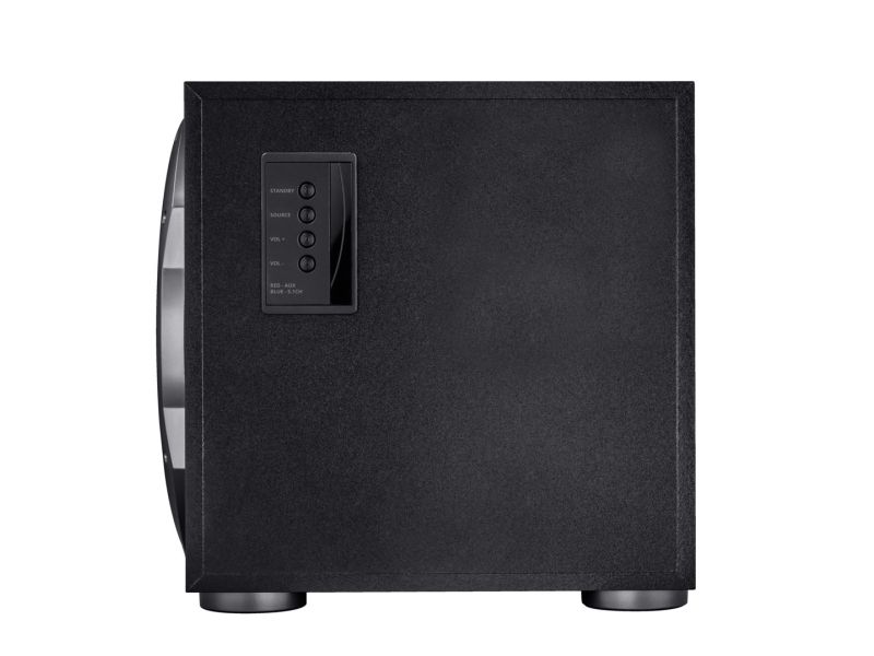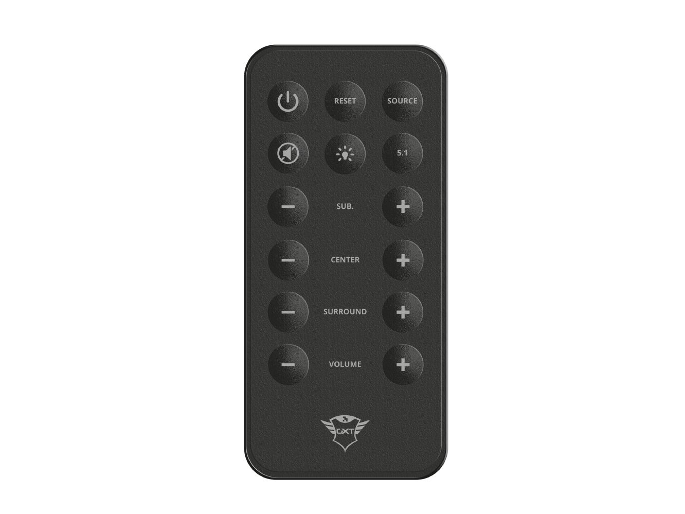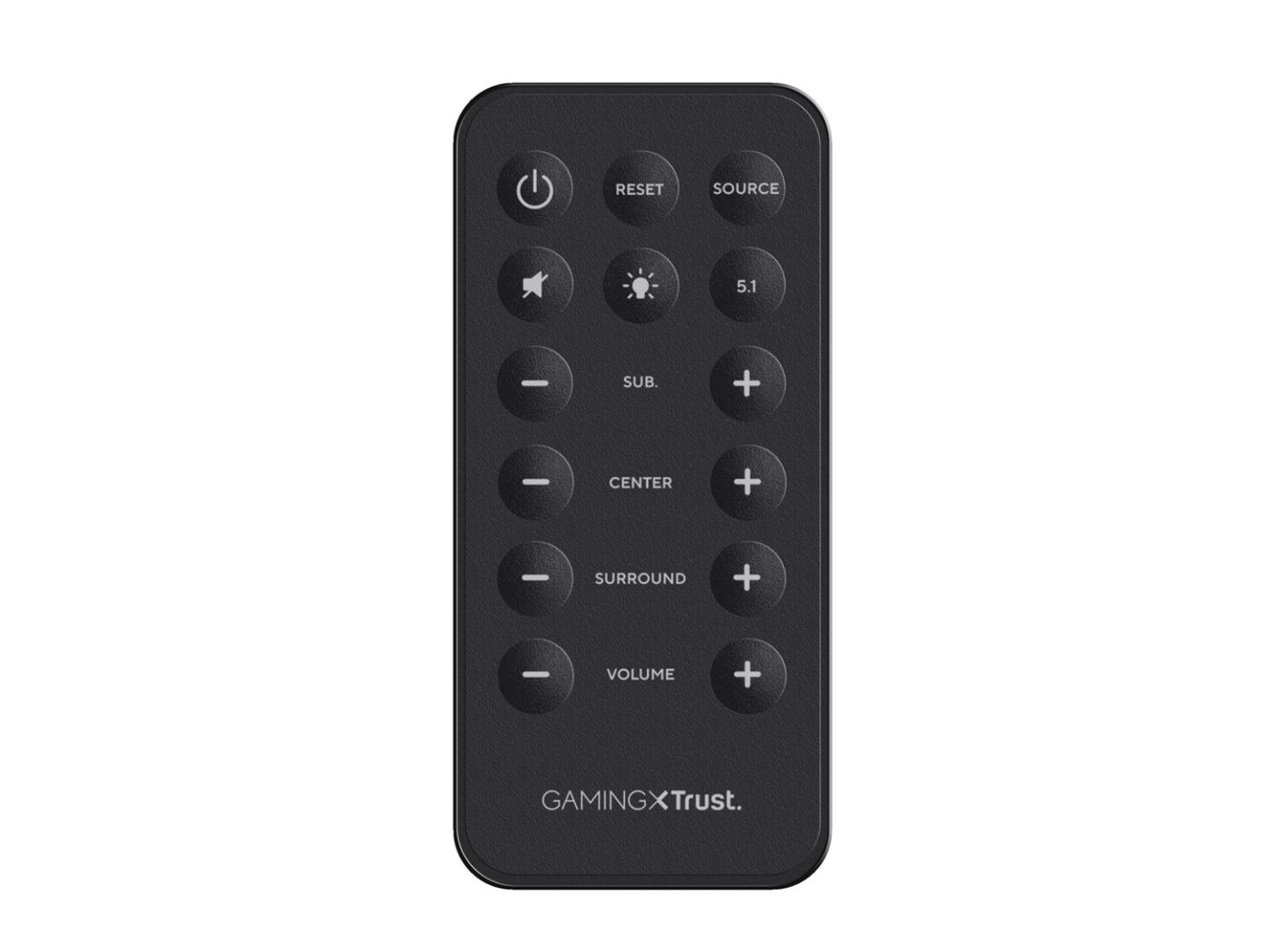 Den trådløse fjernkontrollen gjør at du kan endre volum, kilde (AUX eller 5.1-tilkobling), lys, høyttaler-surroundlyd, subwoofer-volum og volumet til den midtre høyttaleren. Du trenger ikke å stå opp fra stolen din for det! Du kan også slå høyttalersystemet på/av, justere volumet og endre kilden på sidepanelet til subwooferen.