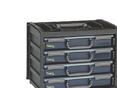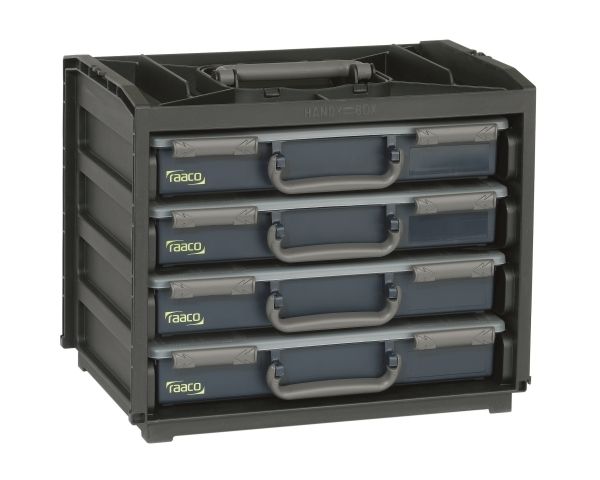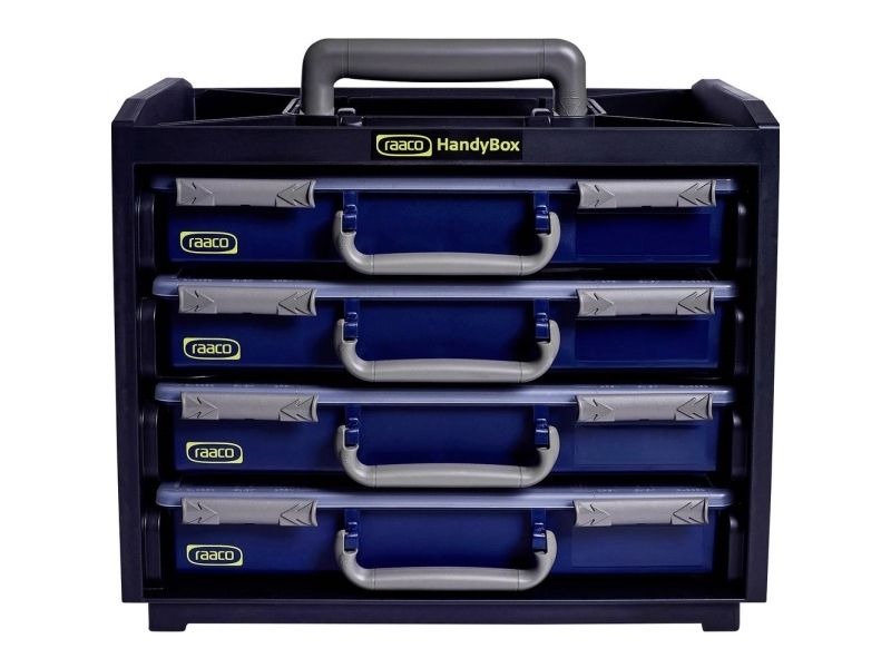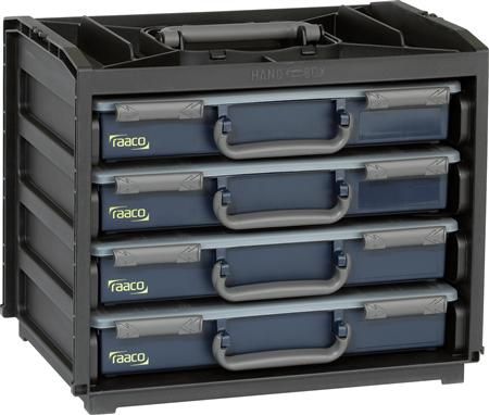 Mobiltelefonboks med 4 bidere Inkl. Ergonomisk bærehåndtag · ved hjælp af profiler i siden låser sortimentskufferten sikkert i bærerammen · mobilboksene kan stables, for eksempel til værkstedsindretning; 2 bokse med 15 og 2 bokse med 17 udtagelige indsatser i forskellige størrelser. Sortimentskasserne er udstyret med udtagelige indsatser af forskellig størrelse og giver dermed en brugervenlig og transportabel lagermulighed til smådele og tilbehør.
