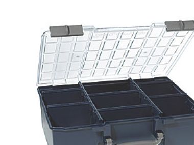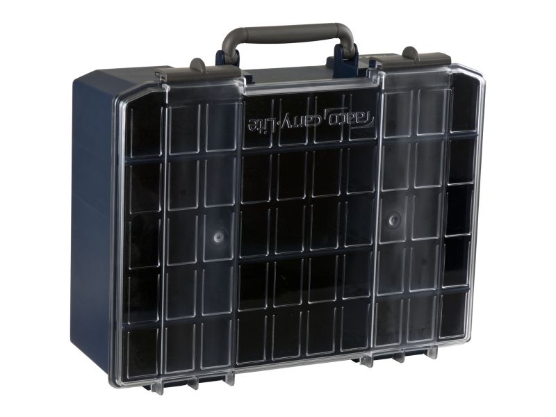 CarryLite 150 med skillevegger. Utstyrt med skyvelås, håndtak og røde markører som viser om esken er lukket korrekt.