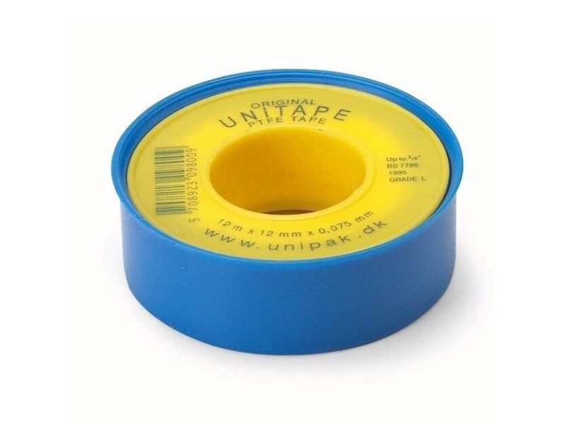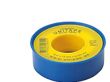UNITAPE (12m x 12mm x 0,075mm) Massefylde 0,35g/cm3. Max rørdiameter: ¾. Anbefalet temperaturområde fra -200ºC til +100ºC. Max tryk: 20 bar. Velegnet til anlæg med vand, drikkevand, varme og luft.