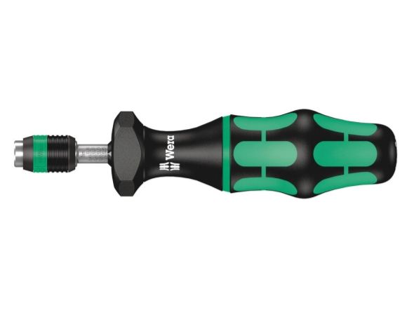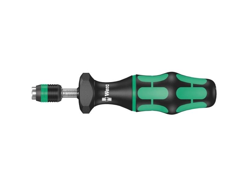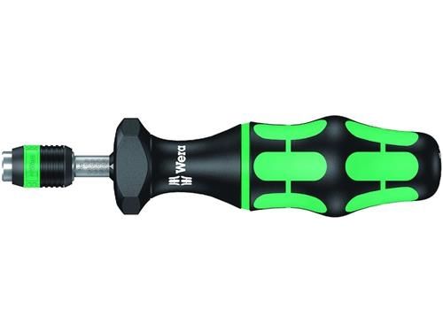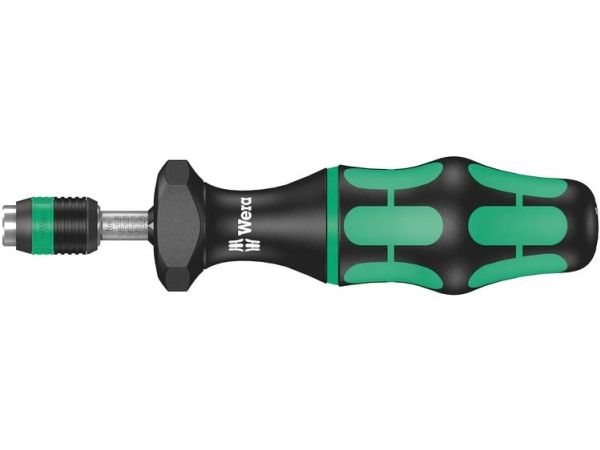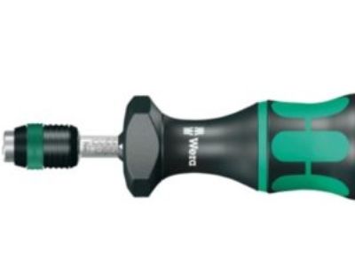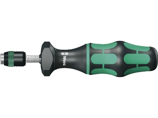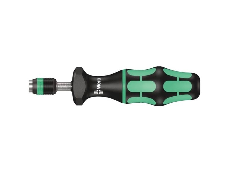 Wera torque screwdriver. Variable torque setting option with highest precision. Simple adjustment of the required torque value without any special tools. Easy-to-read scale value; audible click signal. Rapidaptor quick-release technology for rapid bit change. Unlimited torque to loosen seized screws. Multi-component Kraftform handle with hard and soft zones for high working speeds, whilst being easy on the hand. Suitable for bits with 1/4" hexagon head drive as per DIN ISO 1173-C 6.3 and E 6.3 (ISO 1173).