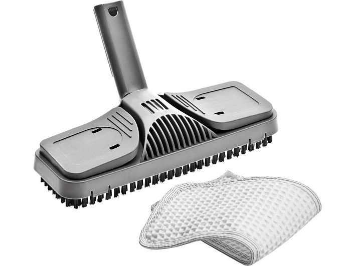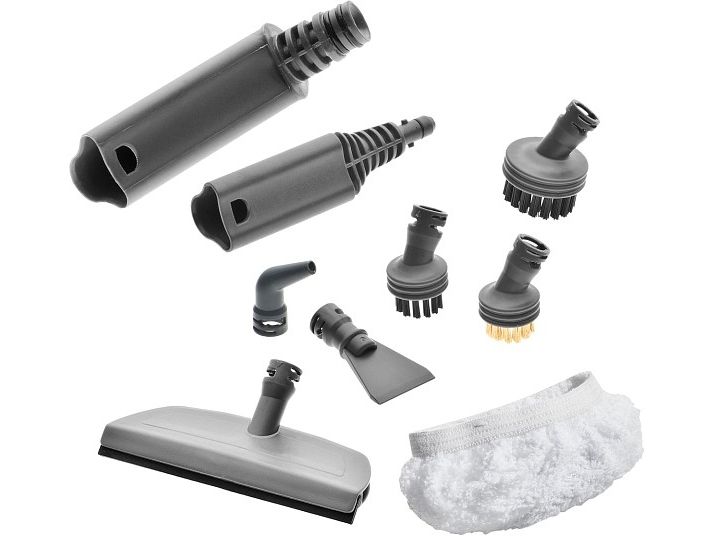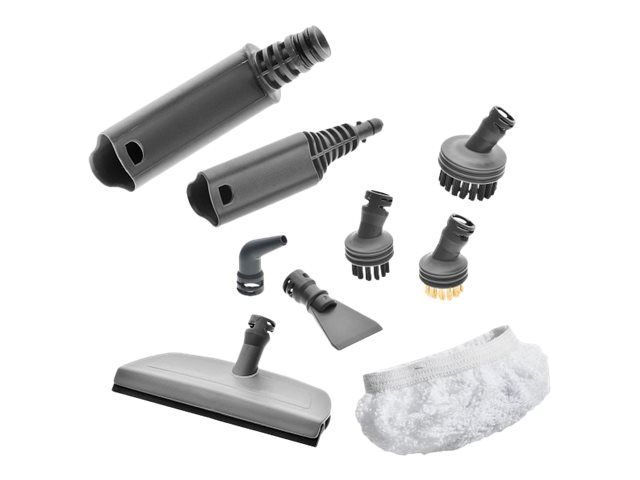 Dampdyse, vindusnalverktøy, forlengerrør (3x), rund børste (3x), hard floor cotton cloth