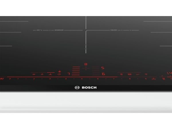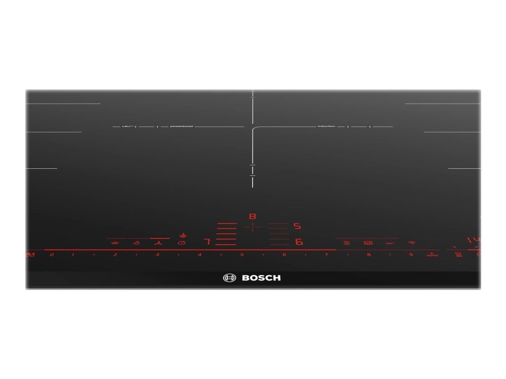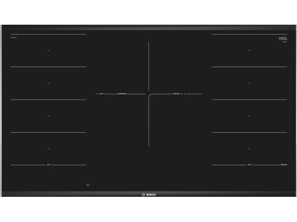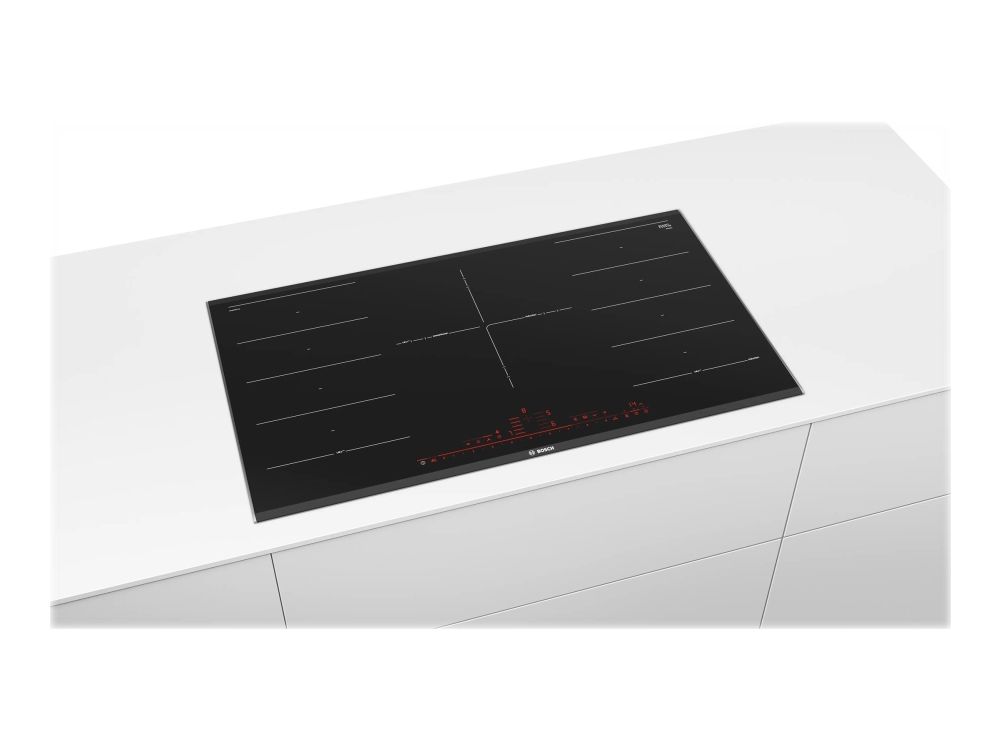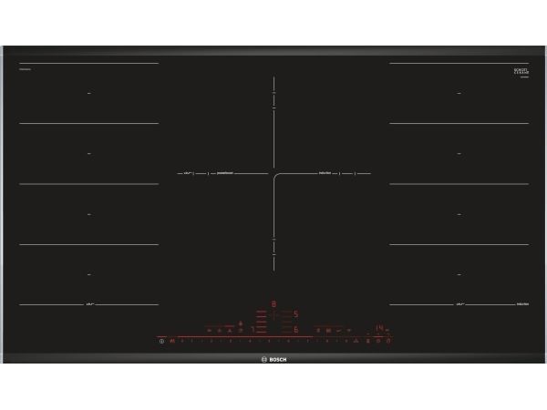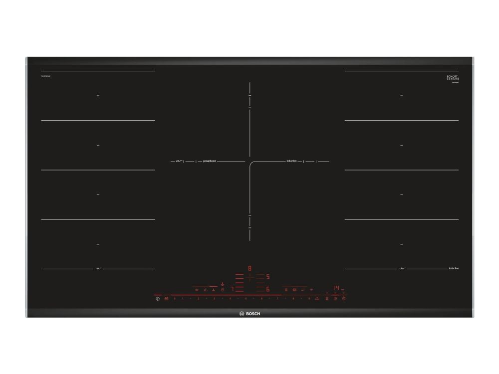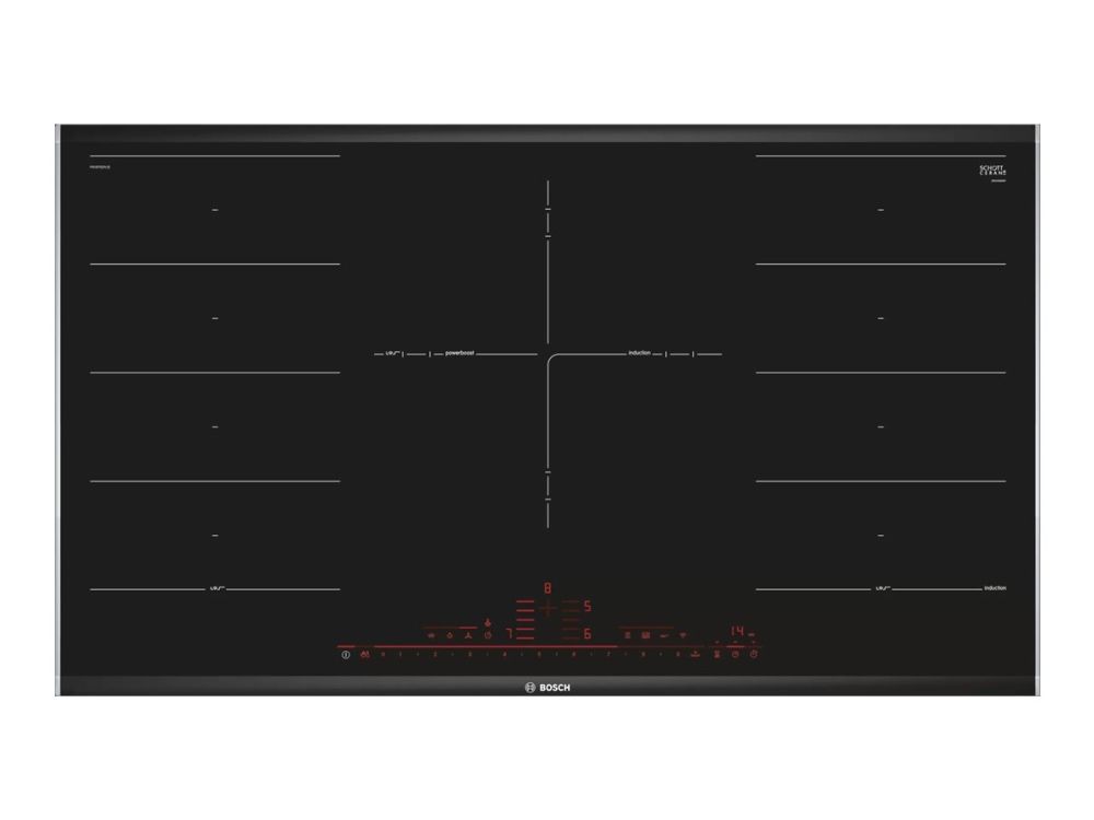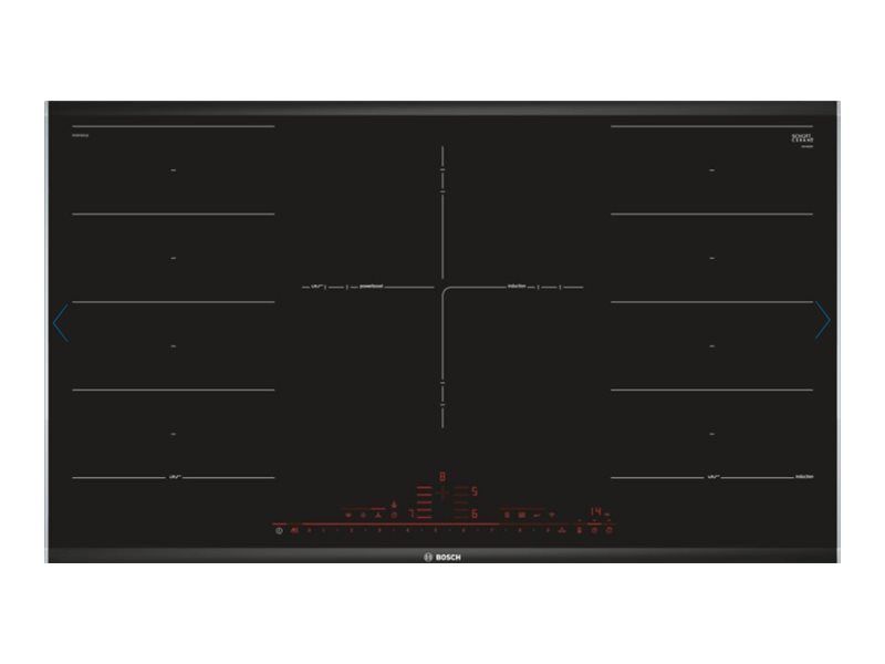 Bosch Serie | 8 PXV975DV1E - Induksjonskomfyrtopp - 5 plater - Nisje - bredde: 88 cm - dybde: 49 cm fasetterte kantlister foran og bak, - med sidepynt av rustfritt stål - svart