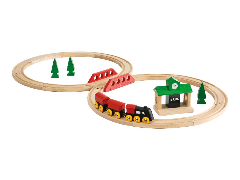 Et klassisk start sett fra 2 år og oppover med alle detaljer i tre. Ta det klassiske toget ut på et eventyr langs skinnene. Ta et stopp ved stasjonen i tre og fortsett langs skinnene mens du passerer trær og krysser en bro. Masse moro for de yngste!
