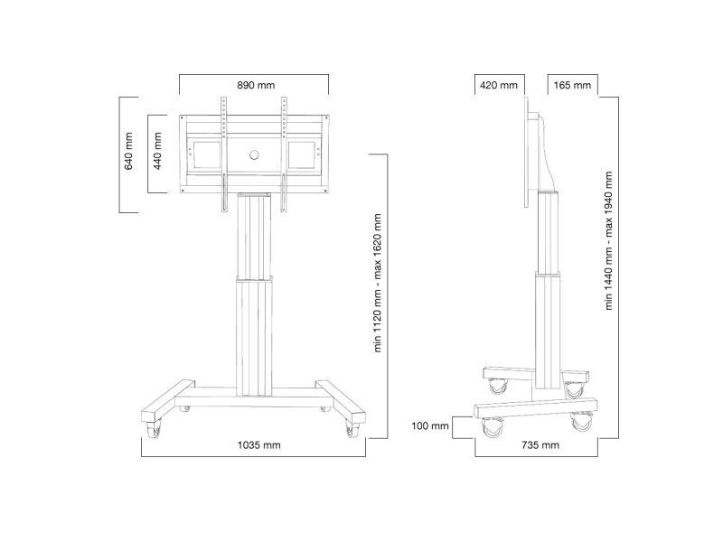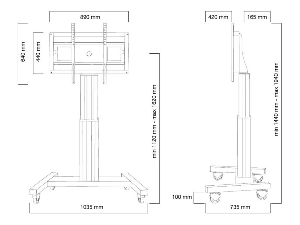 With the Neomounts PLASMA-M2500SILVER automatic height-adjustable floor stand you place a large format flat screen on the floor. Get optimal positioning for both standing and seated audiences, in any application, in any part of your location. Perfect to use in a class room, boardroom, presentation room or public entrance. The PLASMA-M2500SILVER is suited for screens between 42" - 100" and has a load capacity of 150kg. The trolley is suitable for screens with a VESA hole pattern of 200x200, 200x400, 400x400, 400x600 to 600x800mm. Behind the screen is a 6cm deep space available to mount a media player or mini-computer. Cables can be guided at the back of the mount. Easily roll this cart over doorways and thresholds with to the high-quality wheels. The mobile electric floor lift is automatically height-adjustable over a height of 50cm with a remote control. From the floor to the center the distance of the screen is variable from 111cm to 161cm. The trolley features four solid castor wheels, of which the two front wheels are equipped with a brake. The Neomounts PLASMA-M2500SILVER comes in a silver color and is a great choice for space saving placement or when wall, ceiling mounting or desk placement is not an option. All installation material is included with the product.